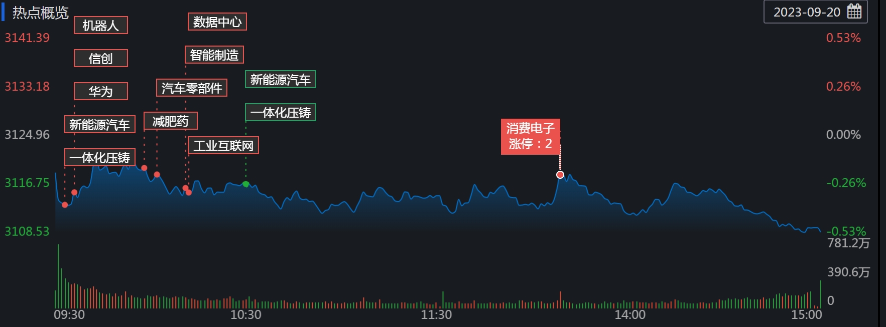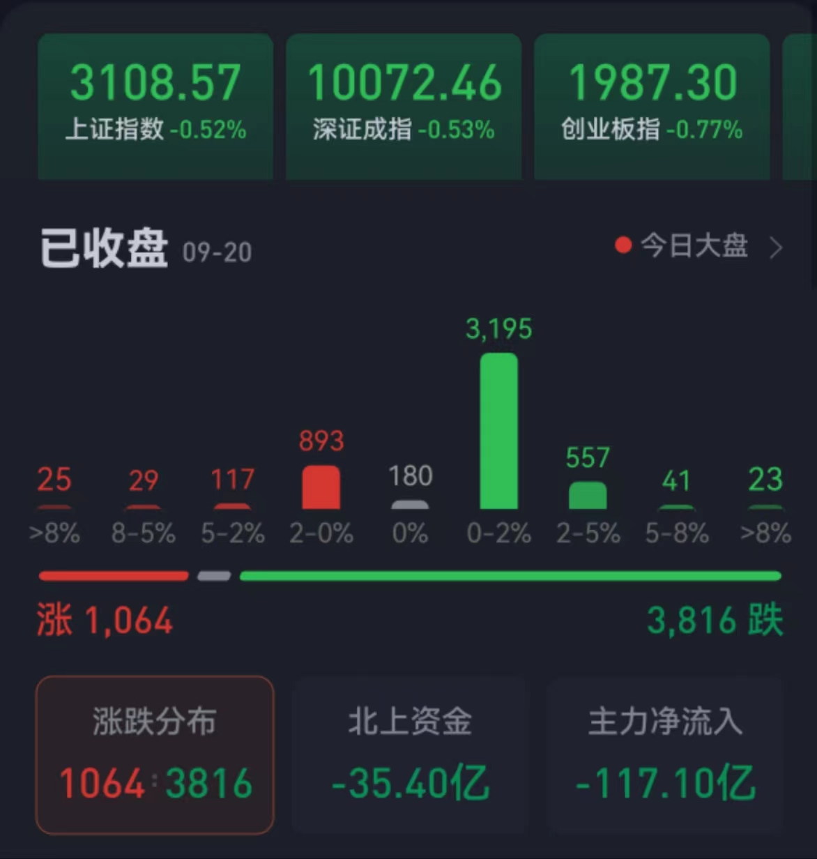 周三(9月20日),A股三大股指繼續(xù)震蕩回落。截至收盤,上證指跌0.52%報(bào)3108.57點(diǎn),深證成指跌0.53%報(bào)10072.46點(diǎn),創(chuàng)業(yè)板指跌0.77%報(bào)1987.3點(diǎn),兩市合計(jì)成交金額5732.63億元,北向資金凈賣出35.4億元??傮w上看,A股個(gè)股跌多漲少,下跌個(gè)股超3800只。其中,漲停個(gè)股達(dá)38只,跌停個(gè)股達(dá)13只。