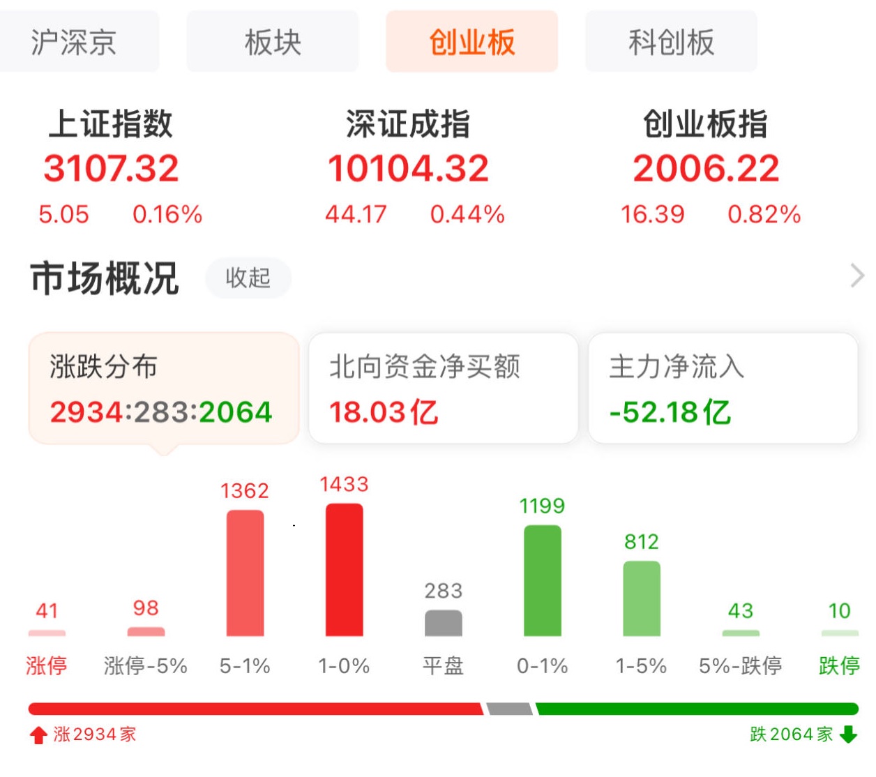 周三(9月27日),A股三大股指集體收漲。截至收盤,上證指數(shù)漲0.16%報(bào)3107.32點(diǎn),深證成指漲0.44%報(bào)10104.32點(diǎn),創(chuàng)業(yè)板指漲0.82%報(bào)2006.22點(diǎn);滬深兩市合計(jì)成交金額7165.34億元??傮w上看,A股個(gè)股漲多跌少。從漲跌停情況看,漲停個(gè)股41只,跌停個(gè)股10只。