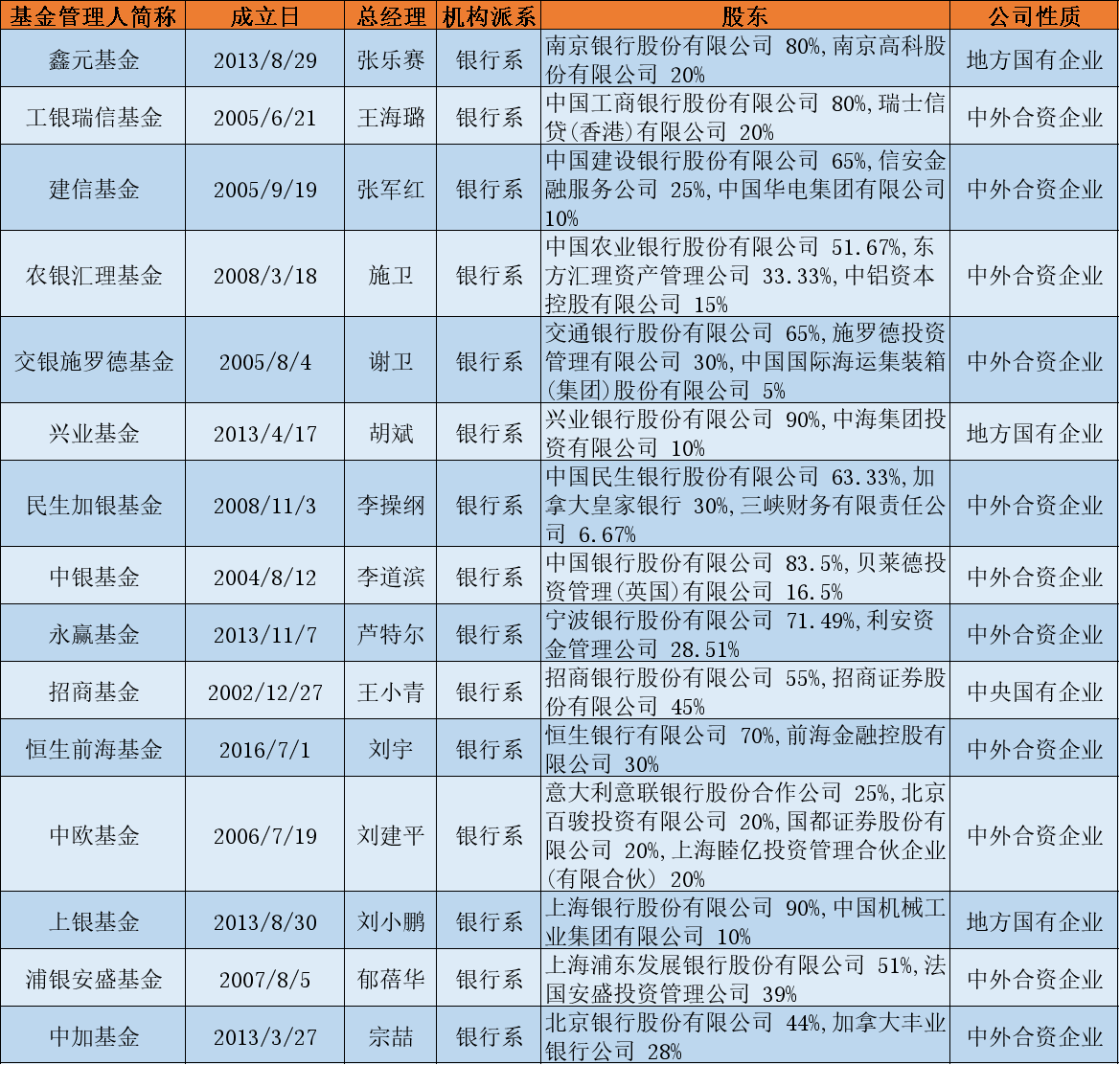 另外,股份制銀行系基金公司共有4家,分別為浦銀安盛基金、招商基金、民生加銀基金、興業(yè)基金;城商行系基金公司共有4家分別為中加基金、上銀基金、鑫元基金、永贏基金。此外,還有意大利意聯(lián)銀行、恒生銀行持股的中歐基金、恒生前海基金,這些銀行系基金公司在近幾年成長(zhǎng)速度迅猛,業(yè)績(jī)可圈可點(diǎn)。