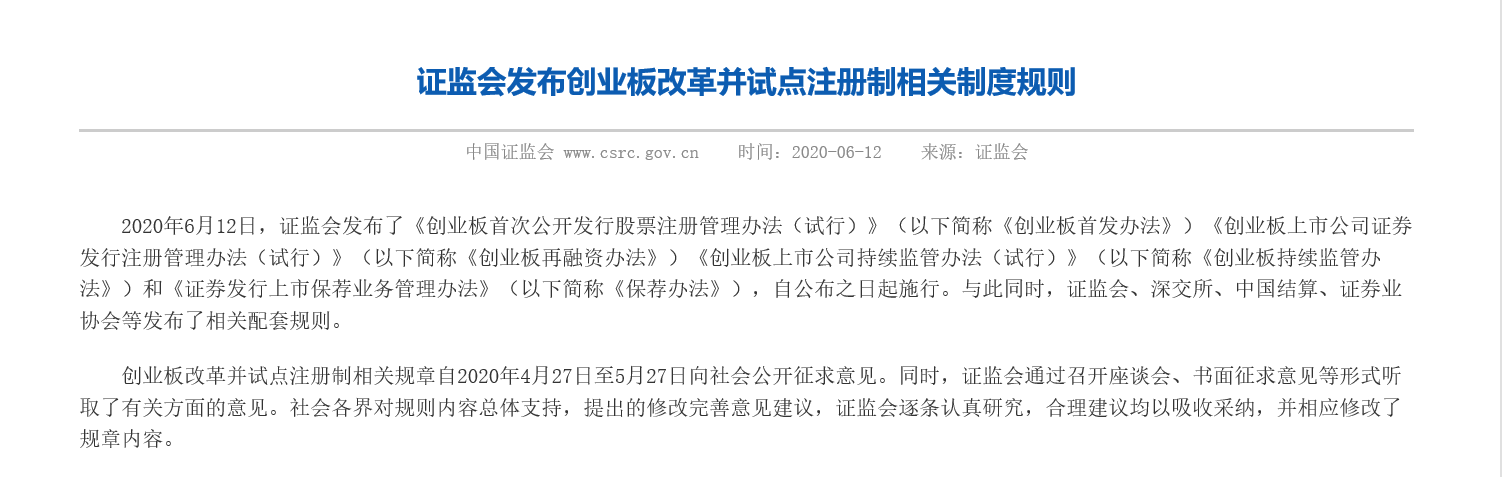 6月12日,證監(jiān)會(huì)發(fā)布創(chuàng)業(yè)板改革并試點(diǎn)注冊(cè)制相關(guān)制度規(guī)則。