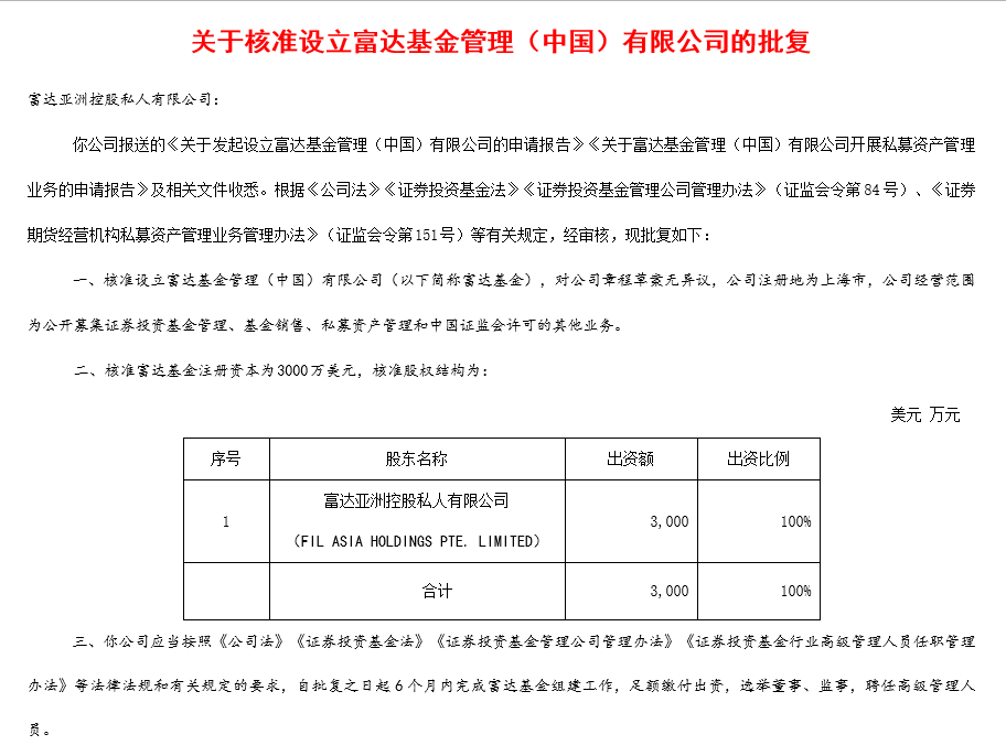 批復(fù)文件顯示,富達基金注冊資本為3000萬美元,富達亞洲控股私人有限公司100%持股,公司注冊地為上海市,公司經(jīng)營范圍為公開募集證券投資基金管理、基金銷售、私募資產(chǎn)管理和中國證監(jiān)會許可的其他業(yè)務(wù)。