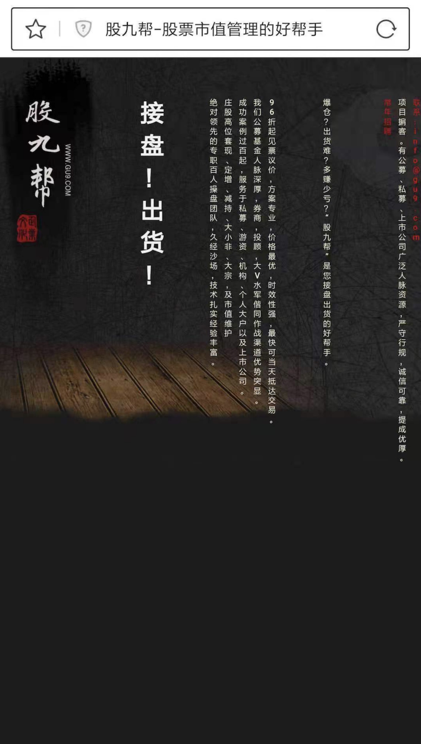 “盤后票網(wǎng)站有了影響力之后,吳承澤成立了股九幫項(xiàng)目,專門收取傭金幫別人出貨。吳承澤前一天在盤后票網(wǎng)站上掛出要出貨的股票,第二天莊家就可以出貨??梢赃x擇由吳承澤團(tuán)隊(duì)來操作賬戶,也可以莊家自己操作賬戶。”陳偉杰進(jìn)一步解釋道。