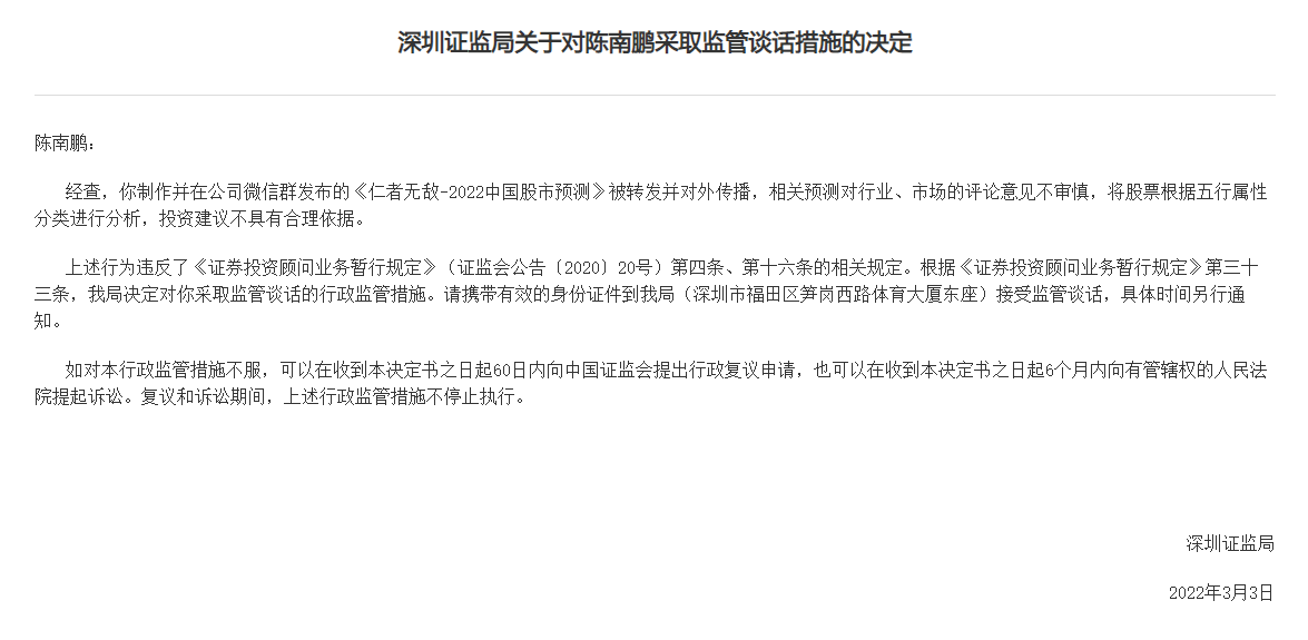深圳證監(jiān)局表示,經(jīng)查,陳南鵬制作并在公司微信群發(fā)布的《仁者無敵-2022中國股市預(yù)測》被轉(zhuǎn)發(fā)并對外傳播,相關(guān)預(yù)測對行業(yè)、市場的評論意見不審慎,將股票根據(jù)五行屬性分類進(jìn)行分析,投資建議不具有合理依據(jù),違反《證券投資顧問業(yè)務(wù)暫行規(guī)定》相關(guān)規(guī)定。深圳證監(jiān)局對陳南鵬采取監(jiān)管談話的行政監(jiān)管措施。