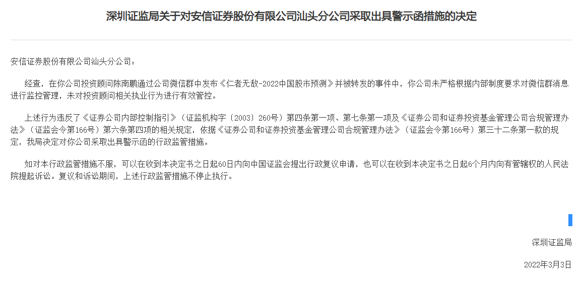 3月11日,深圳證監(jiān)局披露對安信證券汕頭分公司和公司投資顧問陳南鵬的監(jiān)管措施。原因是陳南鵬將股票根據(jù)五行屬性分類進(jìn)行分析,制作并在公司微信群發(fā)布《仁者無敵-2022中國股市預(yù)測》的投資建議,該內(nèi)容被轉(zhuǎn)發(fā)并對外傳播,相關(guān)預(yù)測對行業(yè)、市場的評論意見不審慎。深圳證監(jiān)局認(rèn)為該投資建議不具有合理依據(jù),而公司未對群消息嚴(yán)格管控,故對公司和陳南鵬均采取行政監(jiān)管措施。