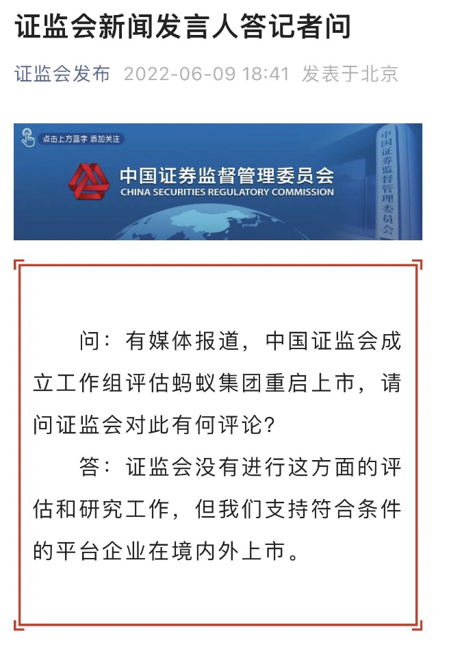 本報訊 近日,有媒體報道,中國證監(jiān)會成立工作組評估螞蟻集團(tuán)重啟上市。對此,6月9日,證監(jiān)會新聞發(fā)言人答記者問時表示,證監(jiān)會沒有進(jìn)行這方面的評估和研究工作,但我們支持符合條件的平臺企業(yè)在境內(nèi)外上市。(吳曉璐)