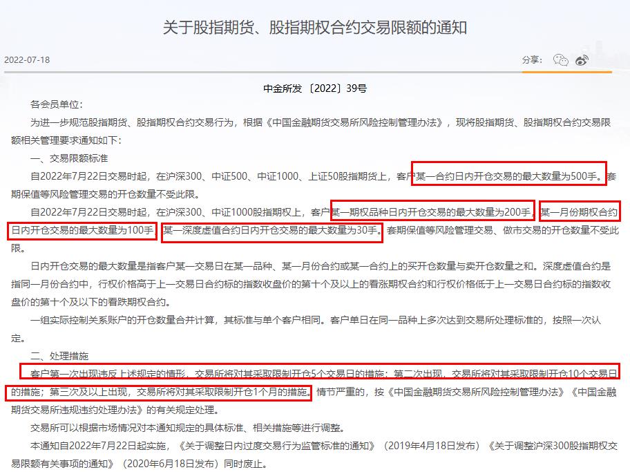 另外,中金所當日發(fā)布的《關(guān)于股指期貨、股指期權(quán)合約交易限額的通知》顯示,