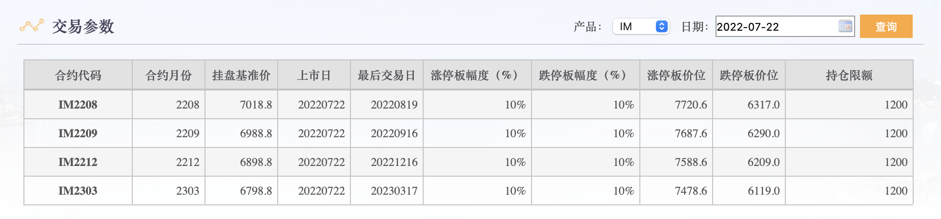 7月21日,中金所發(fā)布《關(guān)于中證1000股指期貨和股指期權(quán)首批上市合約掛盤基準(zhǔn)價(jià)的通知》。7月22日,中證1000股指期貨IM2208合約、IM2209合約、IM2212合約和IM2303合約上市,掛盤基準(zhǔn)價(jià)分別為7018.8點(diǎn)、6988.8點(diǎn)、6898.8點(diǎn)和6798.8點(diǎn)。