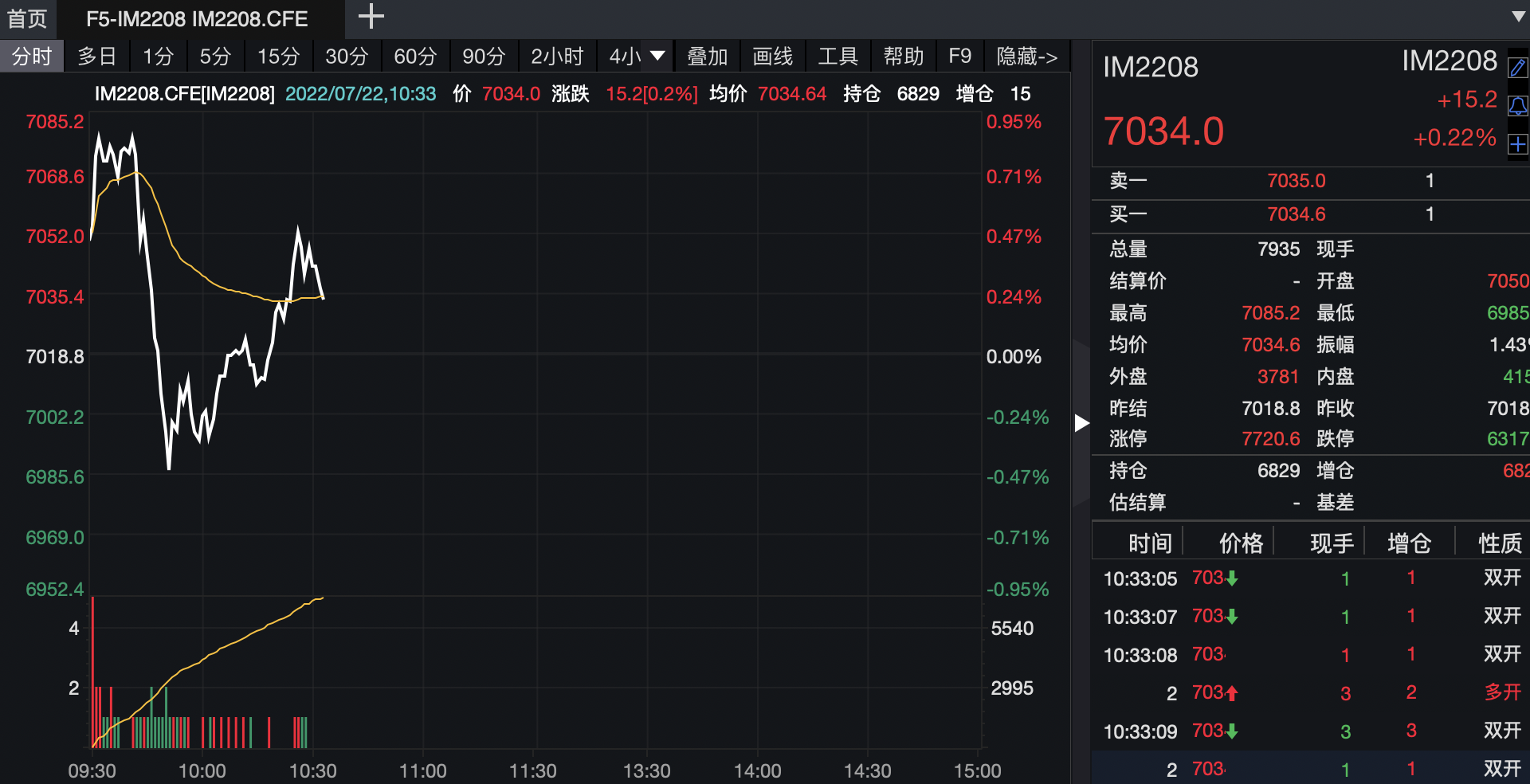 2022年7月22日上午,中證1000股指期貨和期權(quán)相關(guān)合約在中國金融期貨交易所(以下簡稱“中金所”)成功掛牌上市。截至當(dāng)日10點(diǎn)半,中證1000股指期貨主力合約IM2208上漲0.22%,成交量7935手。