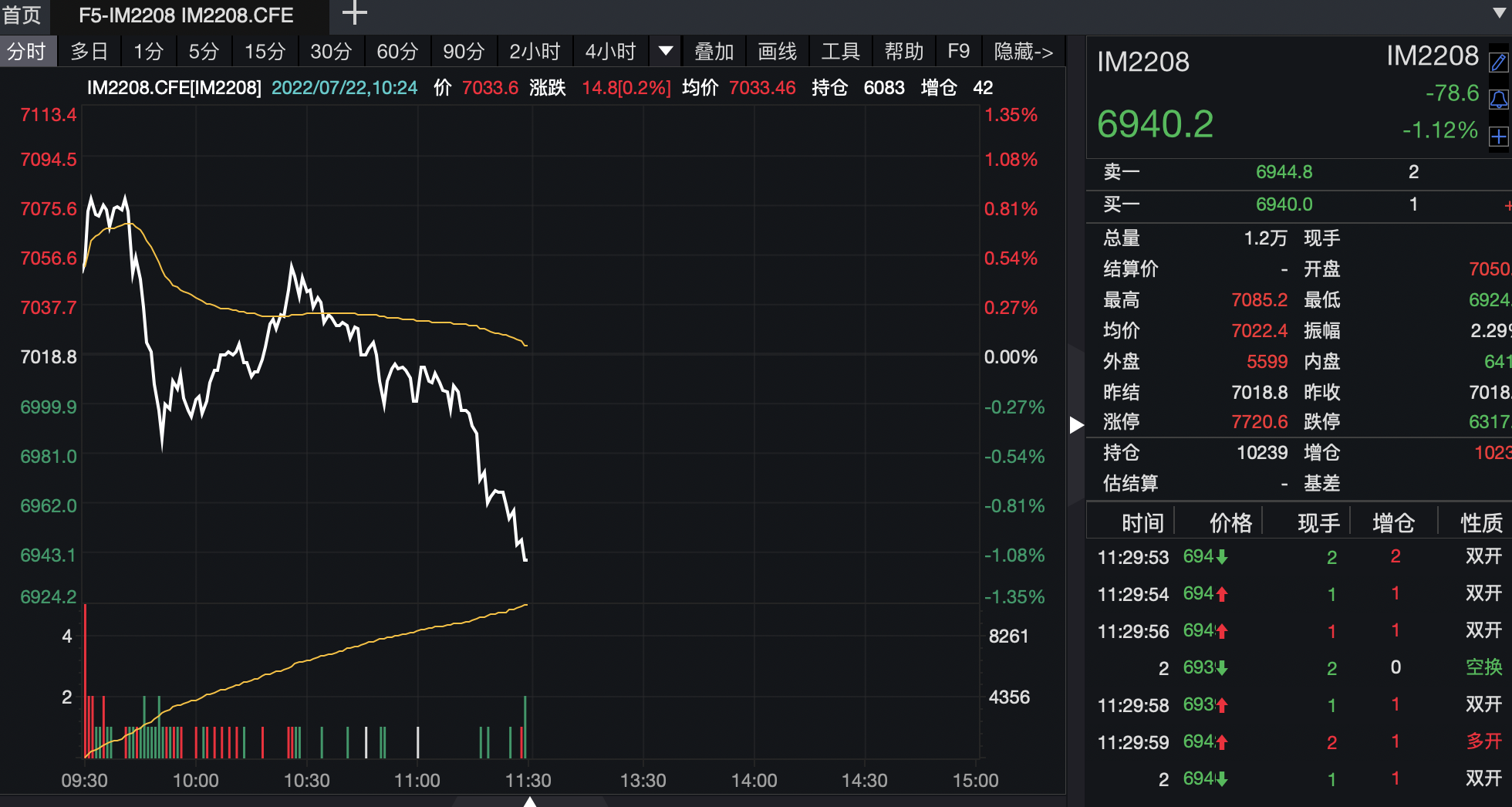中證1000股指期貨上市后沖高回落,截至上午收盤(pán),主力合約IM2208下跌1.12%,成交量1.2萬(wàn)手;上市的4個(gè)中證1000股指期貨合約合計(jì)成交量達(dá)2.07萬(wàn)手。