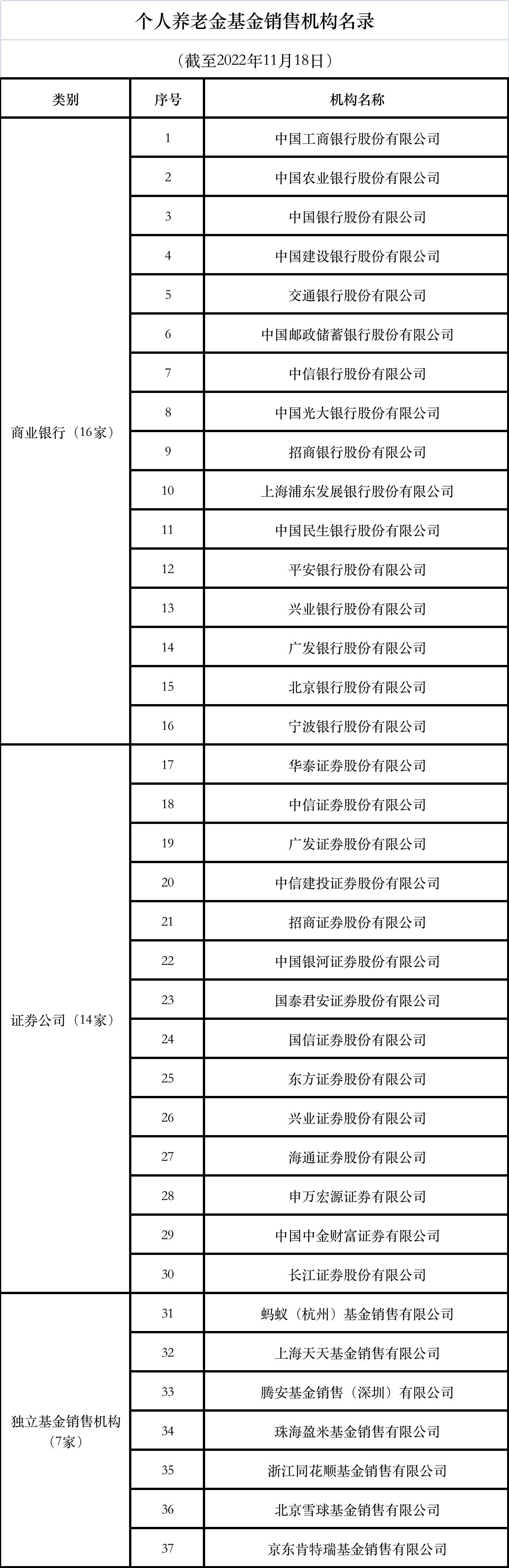個(gè)人養(yǎng)老金基金銷(xiāo)售機(jī)構(gòu)方面,其中,商業(yè)銀行16家,證券公司14家,獨(dú)立基金銷(xiāo)售機(jī)構(gòu)7家。