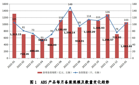 2月22日,中基協(xié)發(fā)布2023年1月份《企業(yè)資產(chǎn)證券化業(yè)務備案運行情況簡報》顯示,2023年1月份,企業(yè)資產(chǎn)證券化產(chǎn)品共備案確認103只,新增備案規(guī)模合計1063.66億元。1月份新增備案規(guī)模環(huán)比增長49.41%,同比減少19.00%。