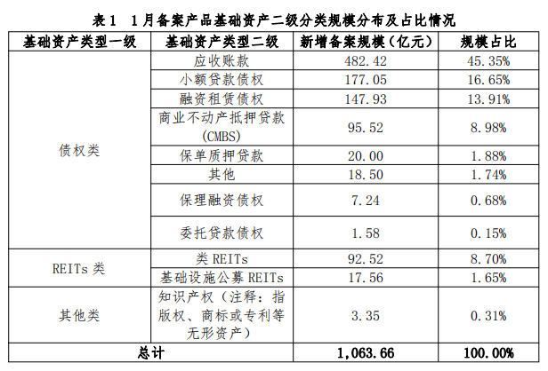 按基礎資產(chǎn)一級分類,1月份債權(quán)類產(chǎn)品新增備案規(guī)模950.24億元;REITs類產(chǎn)品新增備案規(guī)模110.08億元;其他類產(chǎn)品新增備案規(guī)模3.35億元。按基礎資產(chǎn)二級分類,小額貸款債權(quán)、應收賬款、融資租賃債權(quán)、商業(yè)不動產(chǎn)抵押貸款(CMBS)新增備案規(guī)模合計占月度備案產(chǎn)品新增備案規(guī)模的84.89%,較上月增長18.17%。
