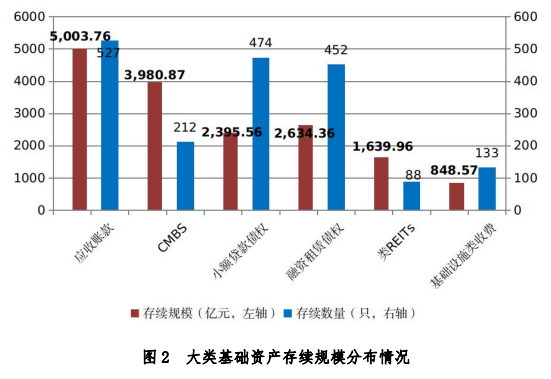 截至2023年1月底,存續(xù)企業(yè)資產(chǎn)證券化產(chǎn)品2206只,存續(xù)規(guī)模19540.34億元,存續(xù)規(guī)模較上月增長0.31%。按基礎資產(chǎn)二級分類來看,應收賬款、商業(yè)不動產(chǎn)抵押貸款(CMBS)、小額貸款債權(quán)、融資租賃債權(quán)、類REITs以及基礎設施類收費存續(xù)規(guī)模合計16503.08億元,占總存續(xù)規(guī)模的84.46%?;A設施公募REITs、保障房、購房尾款等其他類別基礎資產(chǎn)存續(xù)規(guī)模合計3037.26億元,占總存續(xù)規(guī)模的15.54%。