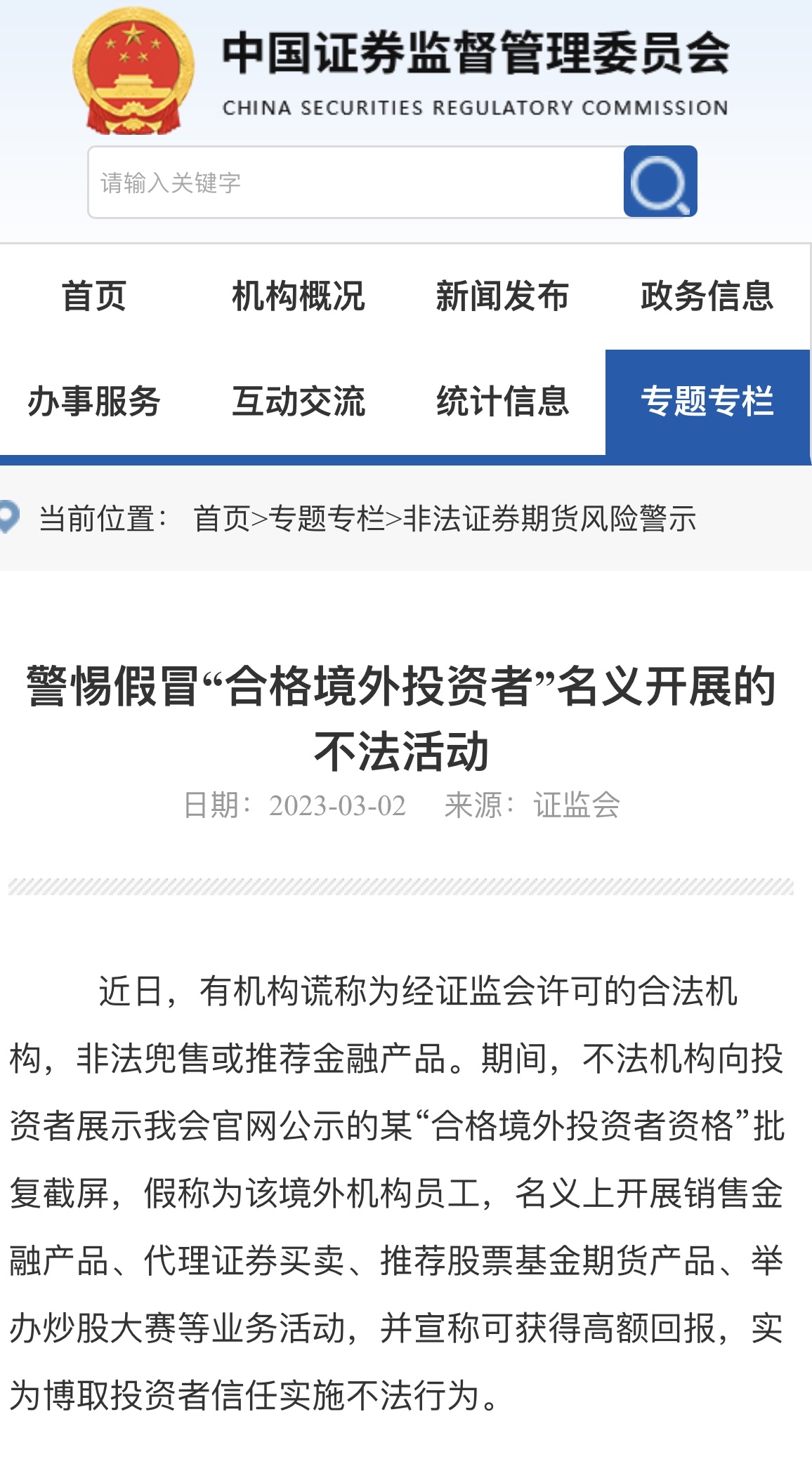 據(jù)證監(jiān)會(huì)網(wǎng)站3月2日消息,近日,有機(jī)構(gòu)謊稱為經(jīng)證監(jiān)會(huì)許可的合法機(jī)構(gòu),非法兜售或推薦金融產(chǎn)品。期間,不法機(jī)構(gòu)向投資者展示證監(jiān)會(huì)官網(wǎng)公示的某“合格境外投資者資格”批復(fù)截屏,假稱為該境外機(jī)構(gòu)員工,名義上開展銷售金融產(chǎn)品、代理證券買賣、推薦股票基金期貨產(chǎn)品、舉辦炒股大賽等業(yè)務(wù)活動(dòng),并宣稱可獲得高額回報(bào),實(shí)為博取投資者信任實(shí)施不法行為。