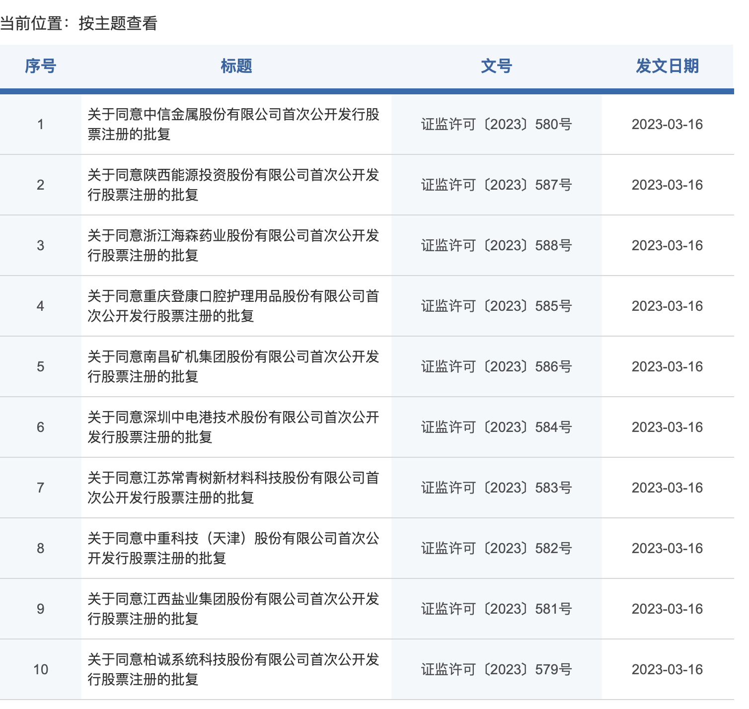 全面注冊制下首批主板IPO注冊生效企業(yè)出爐!3月16日,證監(jiān)會同意10家主板企業(yè)IPO注冊,滬深主板分別為5家,包括中信金屬、江鹽股份、常青科技、中重科技、柏誠股份、中電港、陜能股份、海森藥業(yè)、登康口腔、南礦集團,共10家企業(yè)。