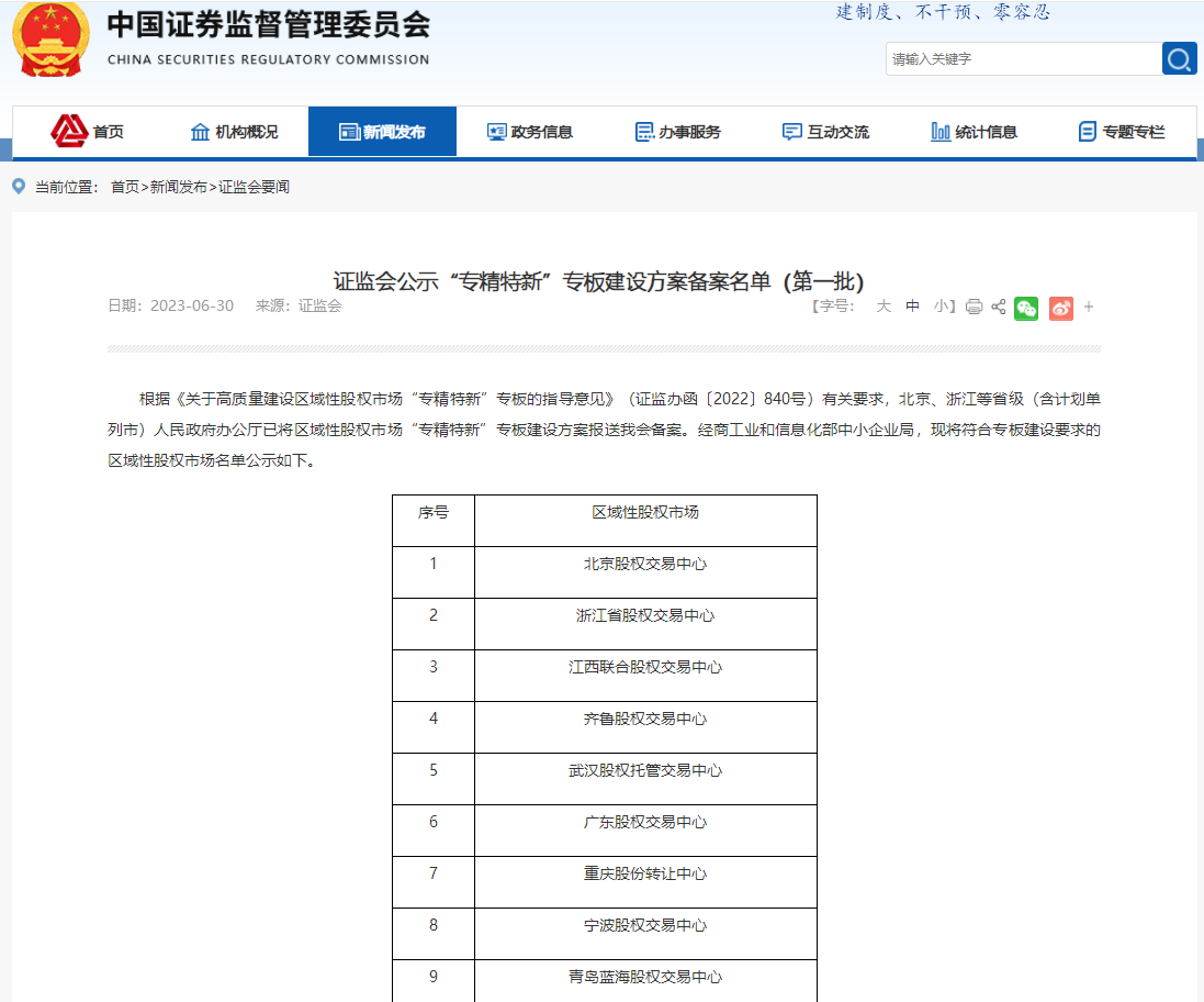 據(jù)證監(jiān)會(huì)網(wǎng)站6月30日消息,根據(jù)《關(guān)于高質(zhì)量建設(shè)區(qū)域性股權(quán)市場(chǎng)“專精特新”專板的指導(dǎo)意見》(證監(jiān)辦函〔2022〕840號(hào))有關(guān)要求,北京、浙江等省級(jí)(含計(jì)劃單列市)人民政府辦公廳已將區(qū)域性股權(quán)市場(chǎng)“專精特新”專板建設(shè)方案報(bào)送證監(jiān)會(huì)備案。