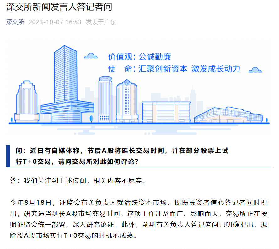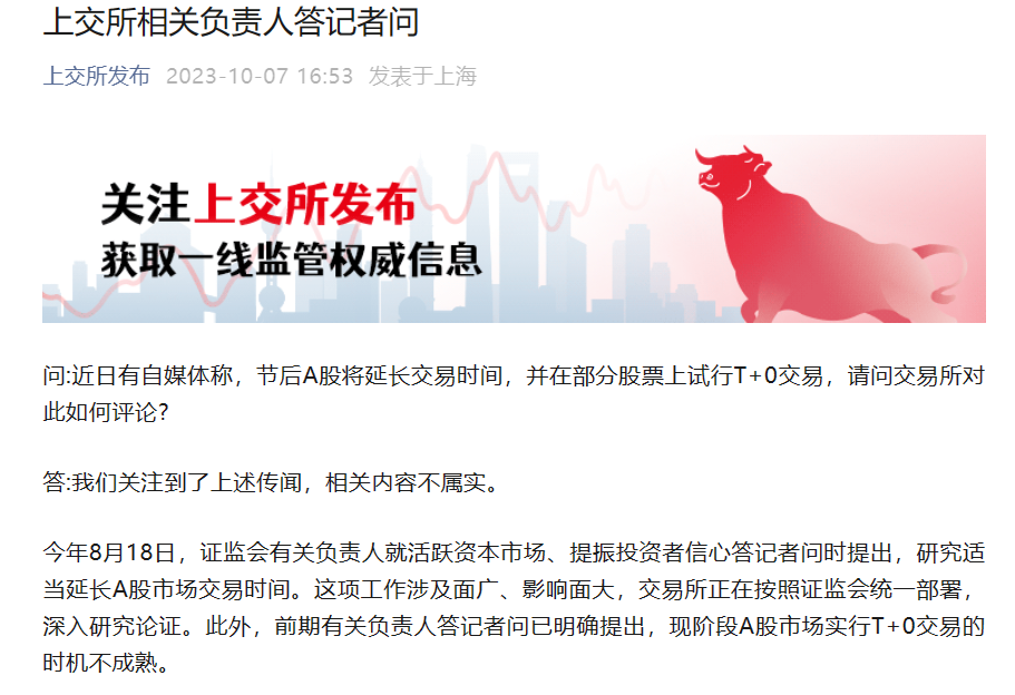 據(jù)滬深交易所微信公眾號消息,10月7日,滬深交易所相關(guān)負(fù)責(zé)人答記者問時表示,“節(jié)后A股將延長交易時間,并在部分股票上試行T+0交易”傳聞不屬實(shí)。