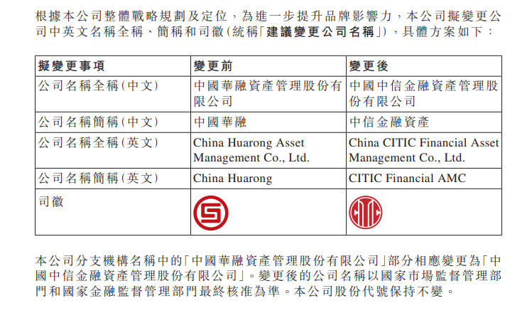 中國(guó)華融公告稱,根據(jù)該公司整體戰(zhàn)略規(guī)劃及定位,為進(jìn)一步提升品牌影響力,擬變更公司名稱為“中國(guó)中信金融資產(chǎn)管理股份有限公司”,簡(jiǎn)稱“中信金融資產(chǎn)”。