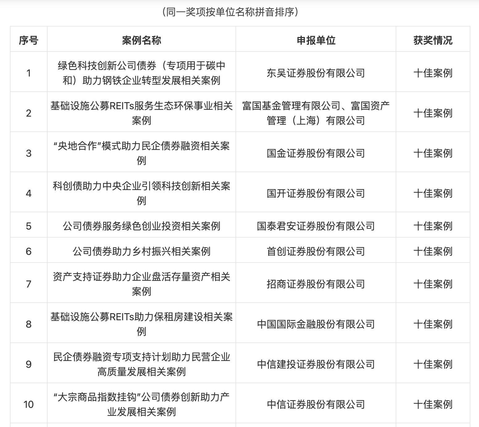 滬深證券交易所組織證券業(yè)協(xié)會、基金業(yè)協(xié)會、行業(yè)專家等成立評審組,經(jīng)過3輪評審,擇優(yōu)評選出一批標(biāo)志性、引領(lǐng)性、示范性、創(chuàng)新性的典型案例,包括10個“十佳案例”和30個“優(yōu)秀案例”。
