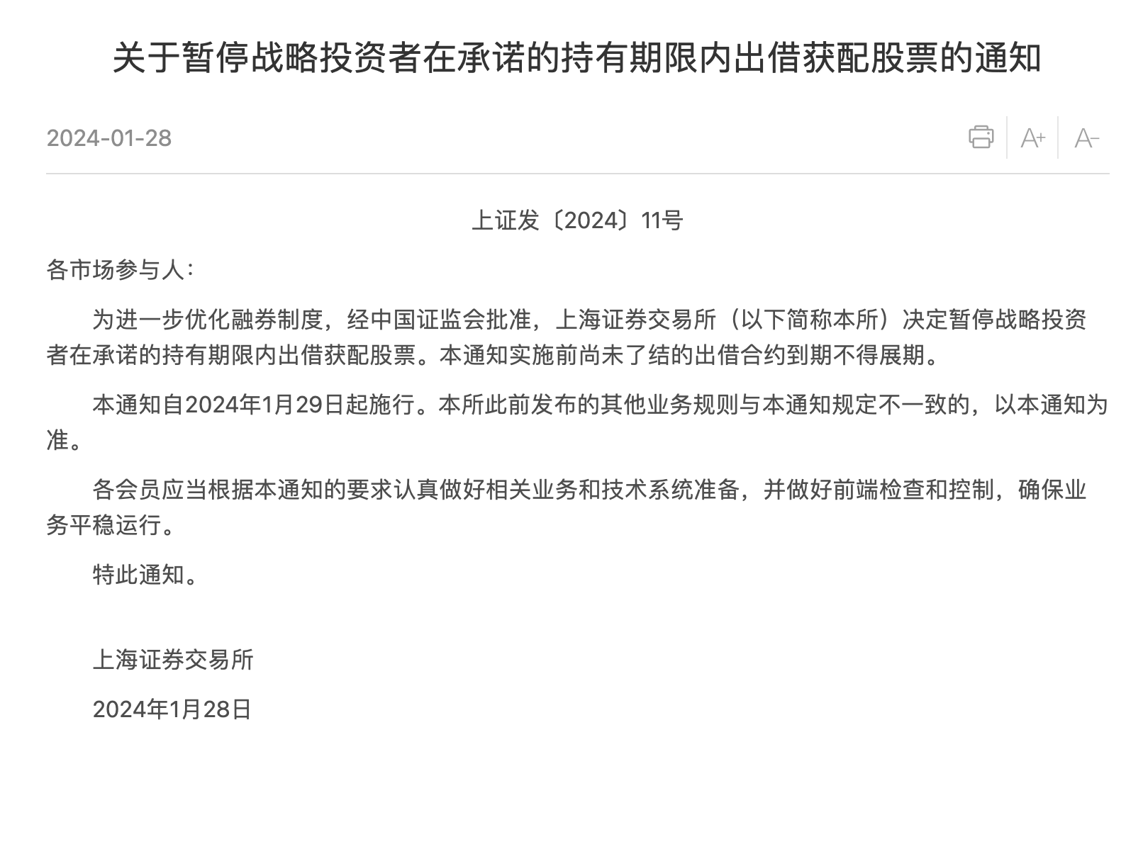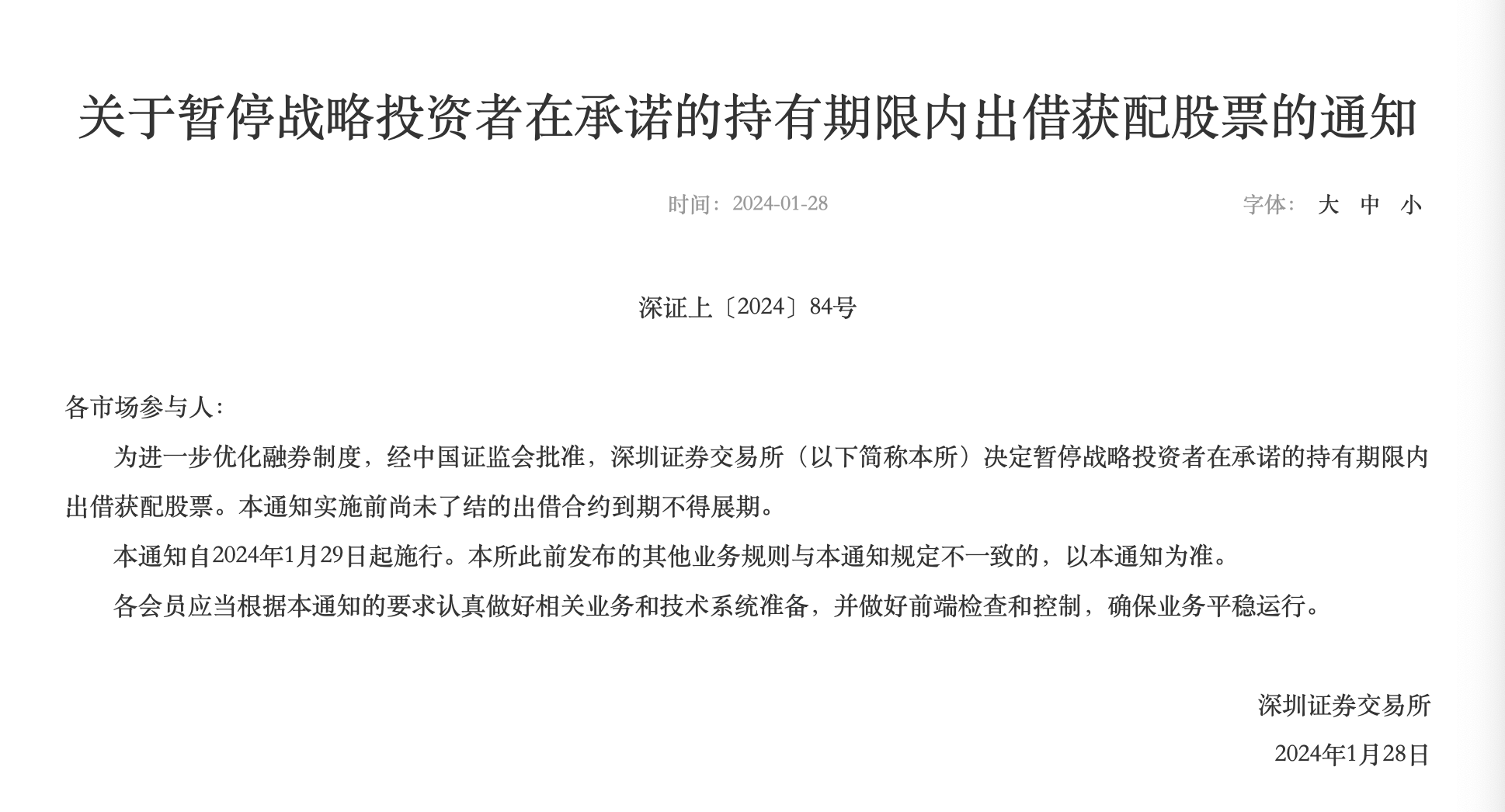 1月28日,上海證券交易所和深圳證券交易所(以下簡稱“滬深交易所”)同步發(fā)布通知稱,為進(jìn)一步優(yōu)化融券制度,經(jīng)中國證監(jiān)會(huì)批準(zhǔn),滬深交易所決定暫停戰(zhàn)略投資者在承諾的持有期限內(nèi)出借獲配股票。