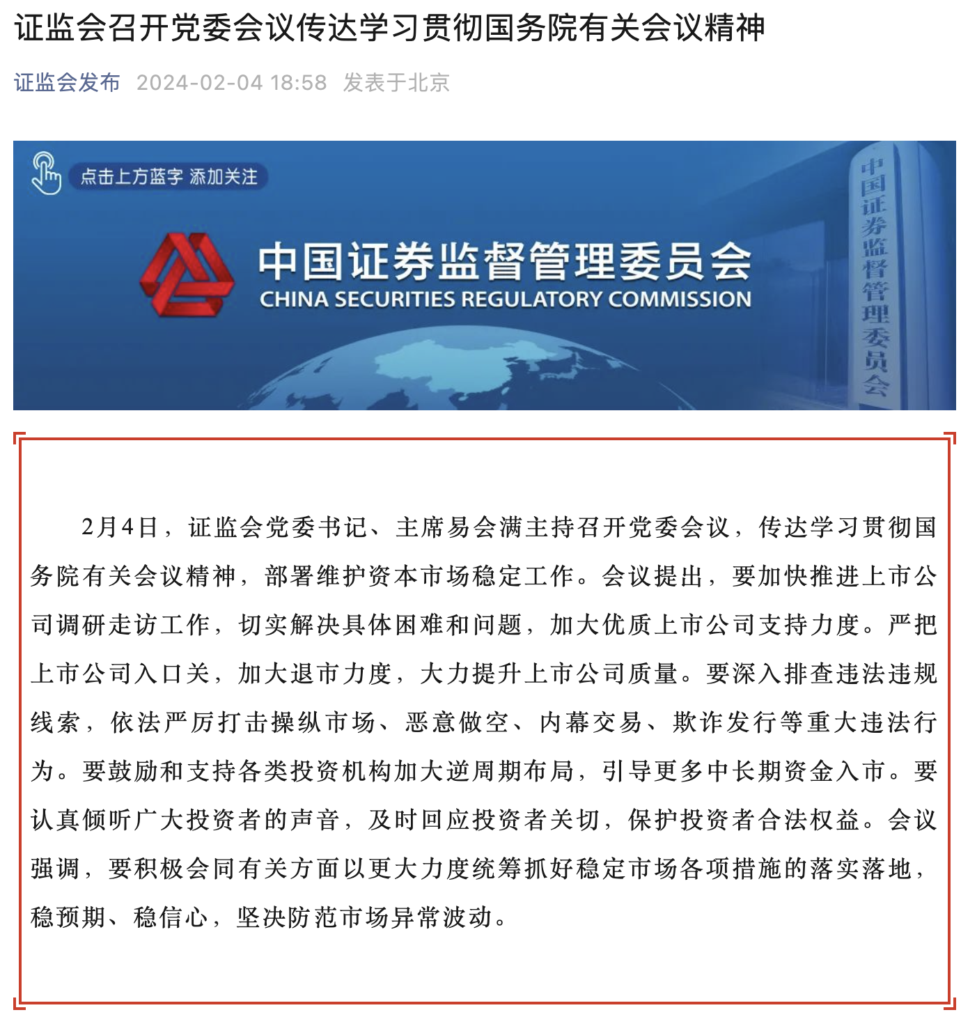 據(jù)證監(jiān)會網(wǎng)站消息,2月4日,證監(jiān)會黨委書記、主席易會滿主持召開黨委會議,傳達(dá)學(xué)習(xí)貫徹國務(wù)院有關(guān)會議精神,部署維護資本市場穩(wěn)定工作。