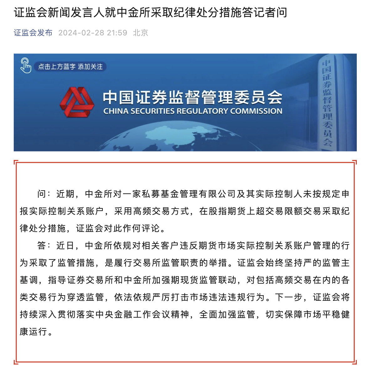 證監(jiān)會新聞發(fā)言人在答記者問時表示,近日,中金所依規(guī)對相關(guān)客戶違反期貨市場實際控制關(guān)系賬戶管理的行為采取了監(jiān)管措施,是履行交易所監(jiān)管職責的舉措。證監(jiān)會始終堅持嚴的監(jiān)管主基調(diào),指導(dǎo)證券交易所和中金所加強期現(xiàn)貨監(jiān)管聯(lián)動,對包括高頻交易在內(nèi)的各類交易行為穿透監(jiān)管,依法依規(guī)嚴厲打擊市場違法違規(guī)行為。