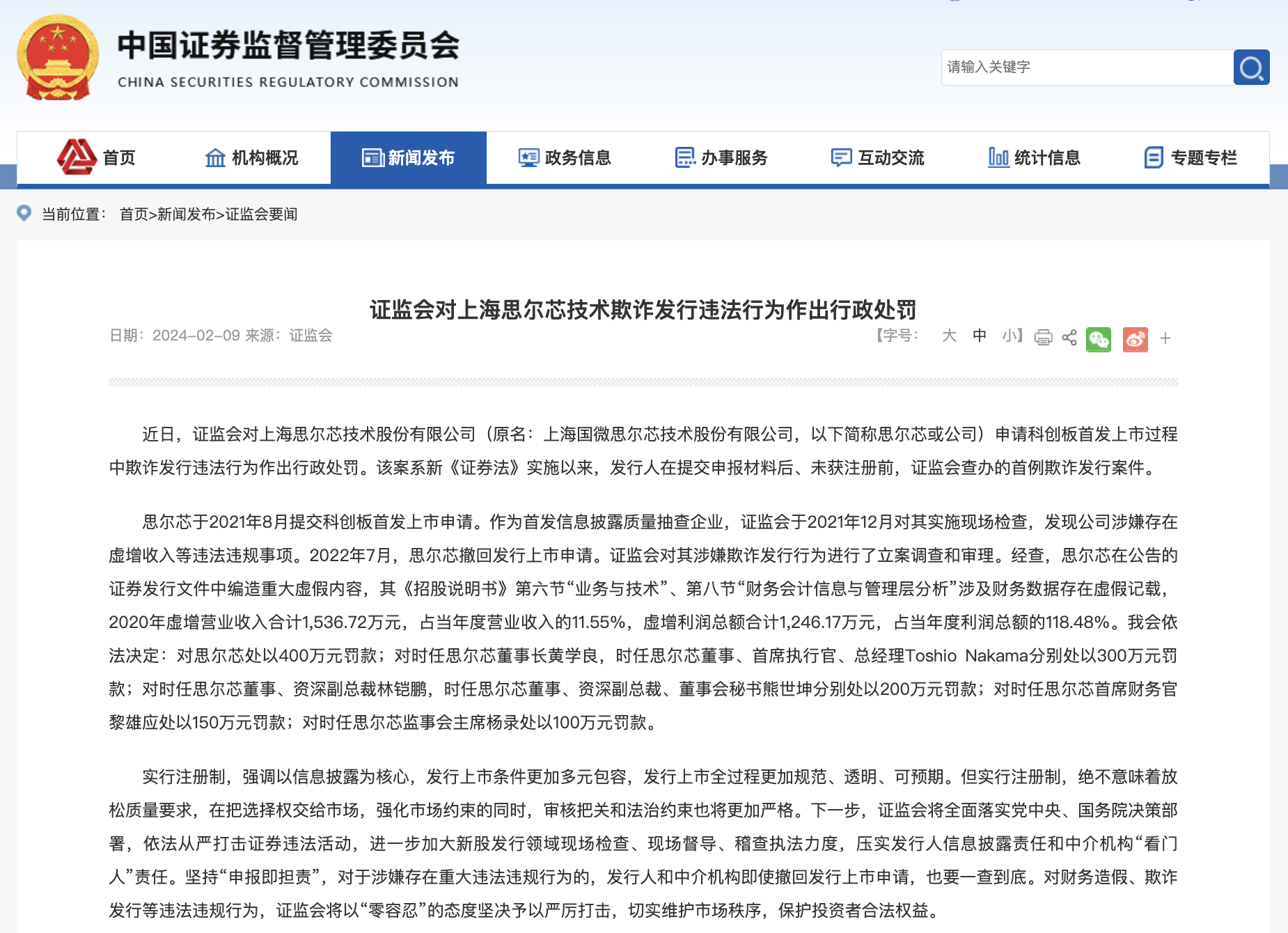 今年年初,證監(jiān)會對思爾芯申請科創(chuàng)板首發(fā)上市過程中欺詐發(fā)行違法行為作出行政處罰。具體而言,證監(jiān)會對思爾芯處以400萬元罰款;對時任思爾芯董事長黃學(xué)良,時任思爾芯董事、首席執(zhí)行官、總經(jīng)理Toshio Nakama分別處以300萬元罰款;對時任思爾芯董事、資深副總裁林鎧鵬,時任思爾芯董事、資深副總裁、董事會秘書熊世坤分別處以200萬元罰款;對時任思爾芯首席財務(wù)官黎雄應(yīng)處以150萬元罰款;對時任思爾芯監(jiān)事會主席楊錄處以100萬元罰款。上述罰款合計1150萬元。
