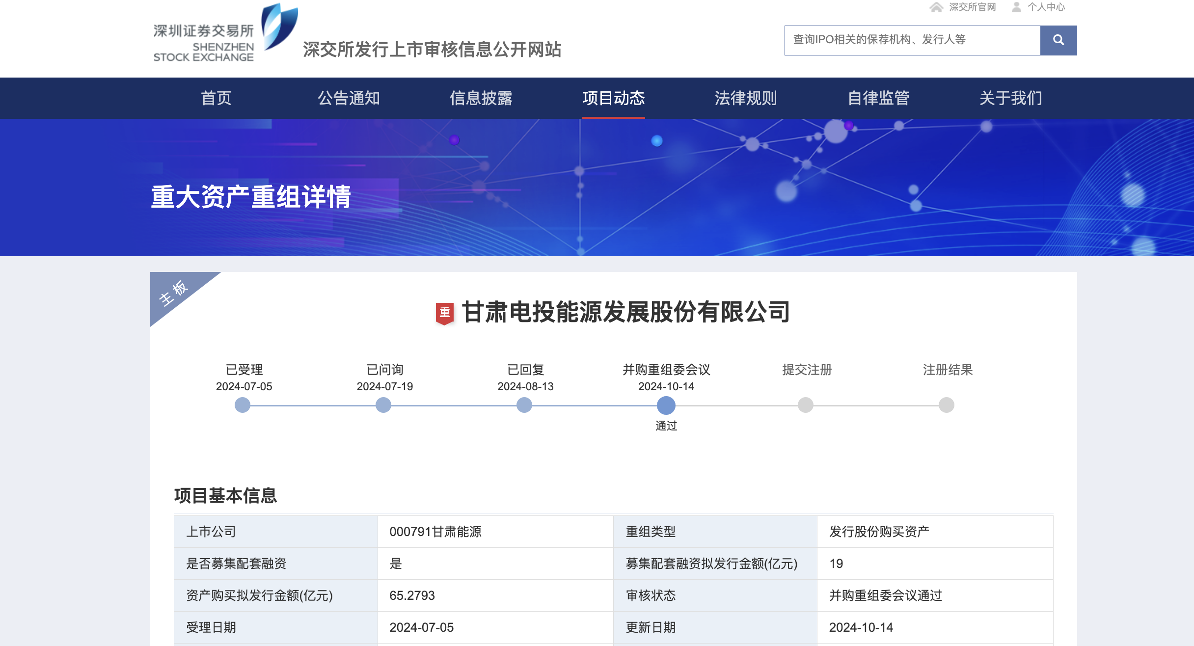 10月14日,深交所并購重組委審議通過甘肅能源發(fā)行股份購買資產(chǎn)項目,該項目從受理到過會歷時101個自然日。