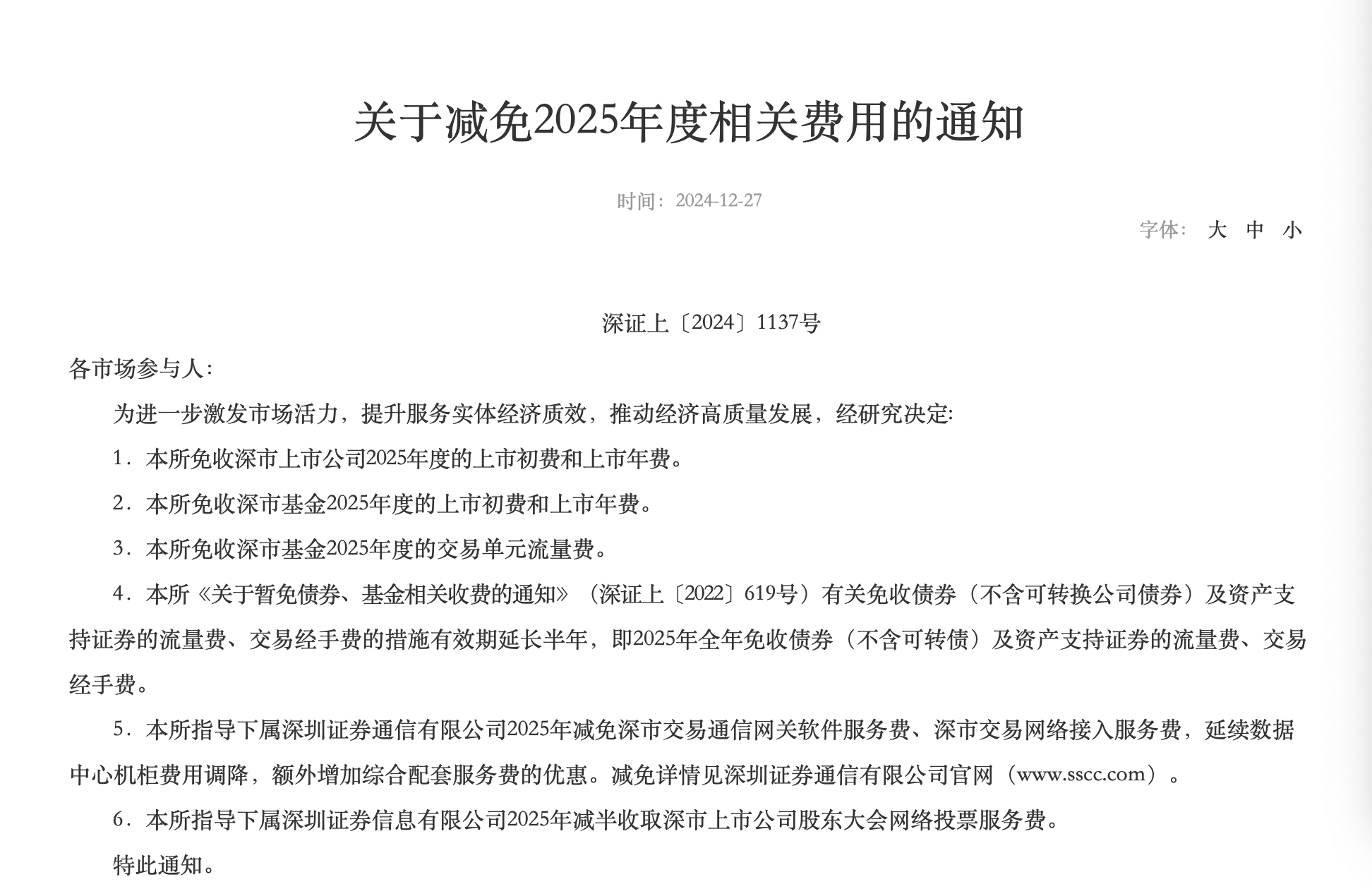 一是免收深市上市公司2025年度的上市初費(fèi)和上市年費(fèi)。