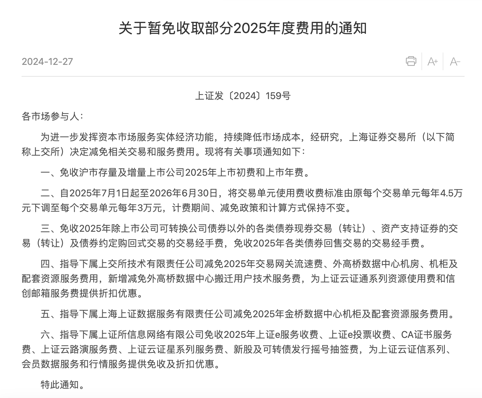 12月27日,滬深交易所分別發(fā)布《關(guān)于暫免收取部分2025年度費(fèi)用的通知》和《關(guān)于減免2025年度相關(guān)費(fèi)用的通知》,推出多項(xiàng)2025年降費(fèi)措施。