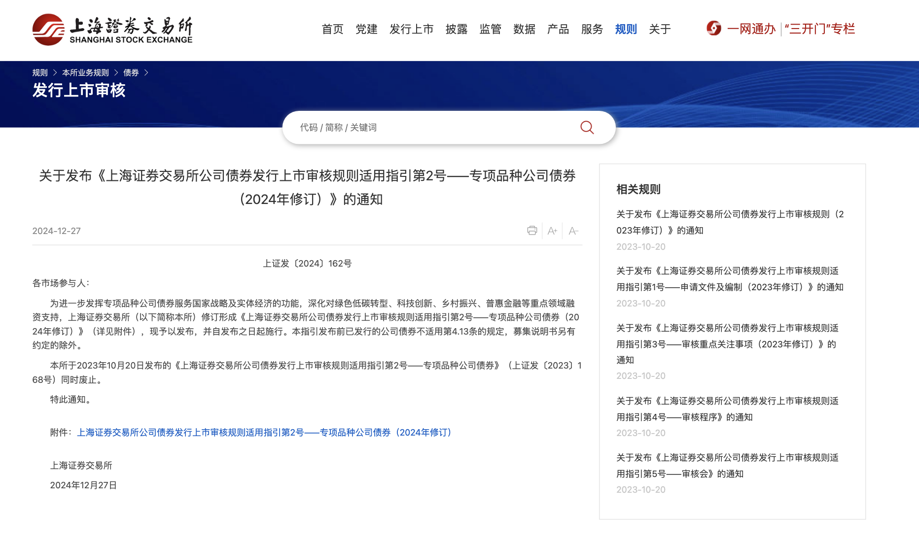 12月27日,在中國證監(jiān)會的指導下,上交所修訂發(fā)布《上海證券交易所公司債券發(fā)行上市審核規(guī)則適用指引第2號——專項品種公司債券(2024年修訂)》(以下簡稱《專項品種公司債券指引》)。