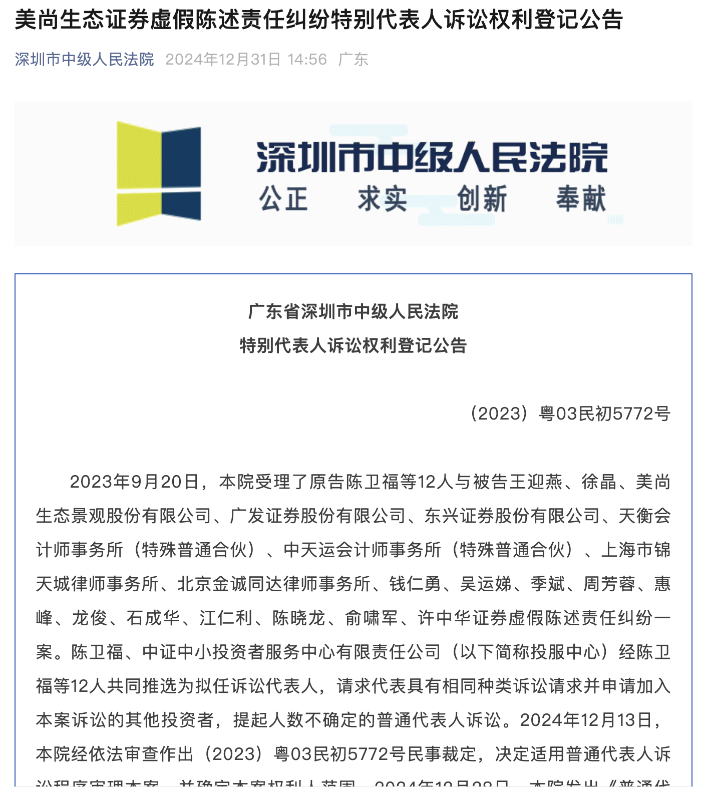 12月31日,廣東省深圳市中級人民法院(簡稱“深圳中院”)發(fā)布美尚生態(tài)證券虛假陳述責任糾紛特別代表人訴訟權利登記公告,這意味著資本市場又一單集體訴訟誕生。而這距離深圳中院發(fā)布普通代表人訴訟權利登記公告(12月28日)僅過去3天。