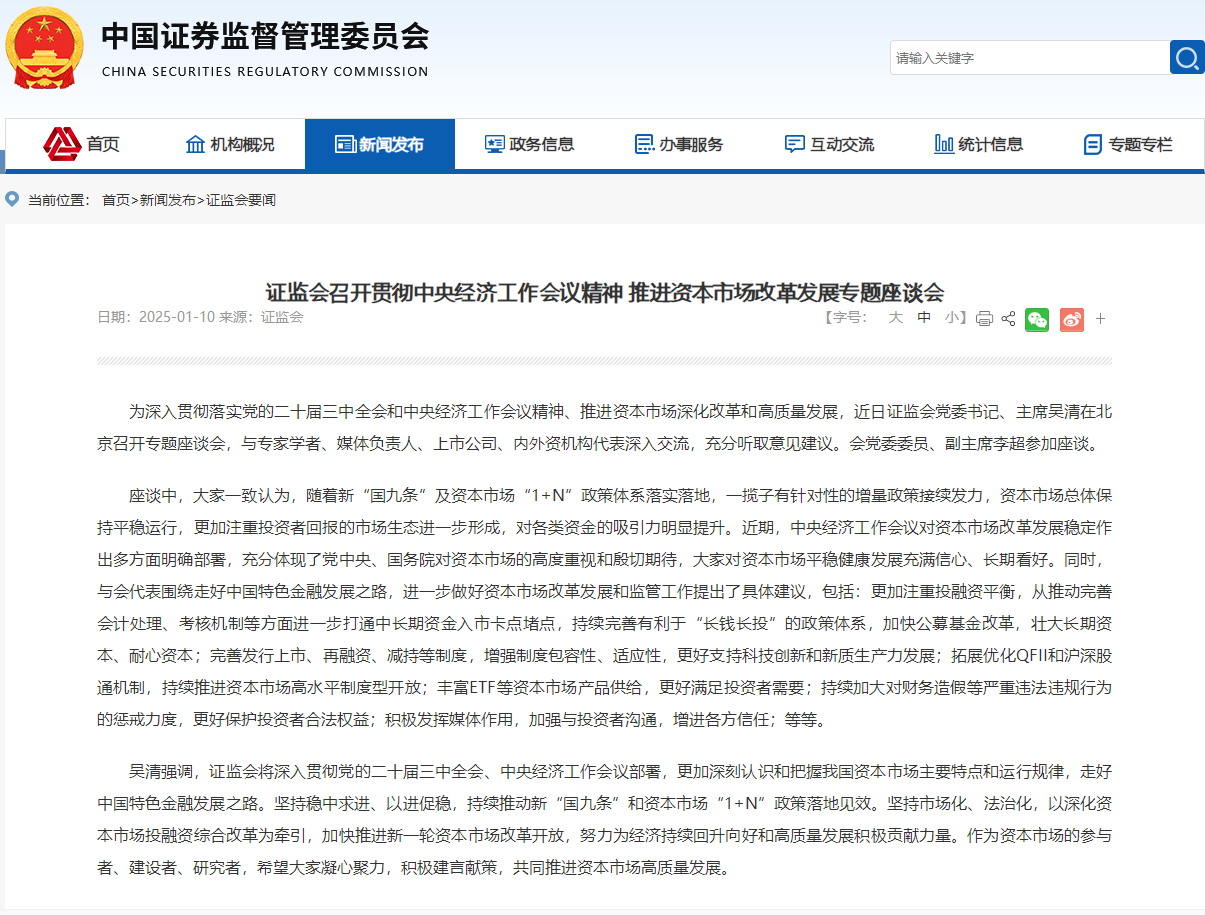 據(jù)證監(jiān)會網(wǎng)站1月10日消息,為深入貫徹落實黨的二十屆三中全會和中央經(jīng)濟工作會議精神、推進資本市場深化改革和高質(zhì)量發(fā)展,近日證監(jiān)會黨委書記、主席吳清在北京召開專題座談會,與專家學者、媒體負責人、上市公司、內(nèi)外資機構(gòu)代表深入交流,充分聽取意見建議。證監(jiān)會黨委委員、副主席李超參加座談。