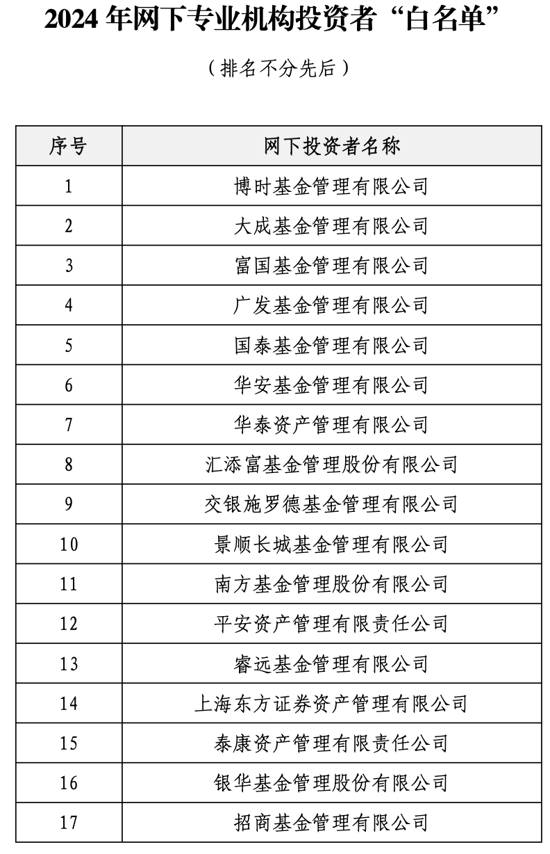 為深入貫徹落實(shí)黨的二十屆三中全會和中央金融工作會議精神、新“國九條”決策部署以及中國證監(jiān)會“科創(chuàng)板八條”有關(guān)要求,強(qiáng)化詢報價行為監(jiān)管,充分發(fā)揮網(wǎng)下專業(yè)機(jī)構(gòu)投資者示范帶動作用,7月25日,中國證券業(yè)協(xié)會(以下簡稱協(xié)會)發(fā)布2024年網(wǎng)下專業(yè)機(jī)構(gòu)投資者“白名單”。