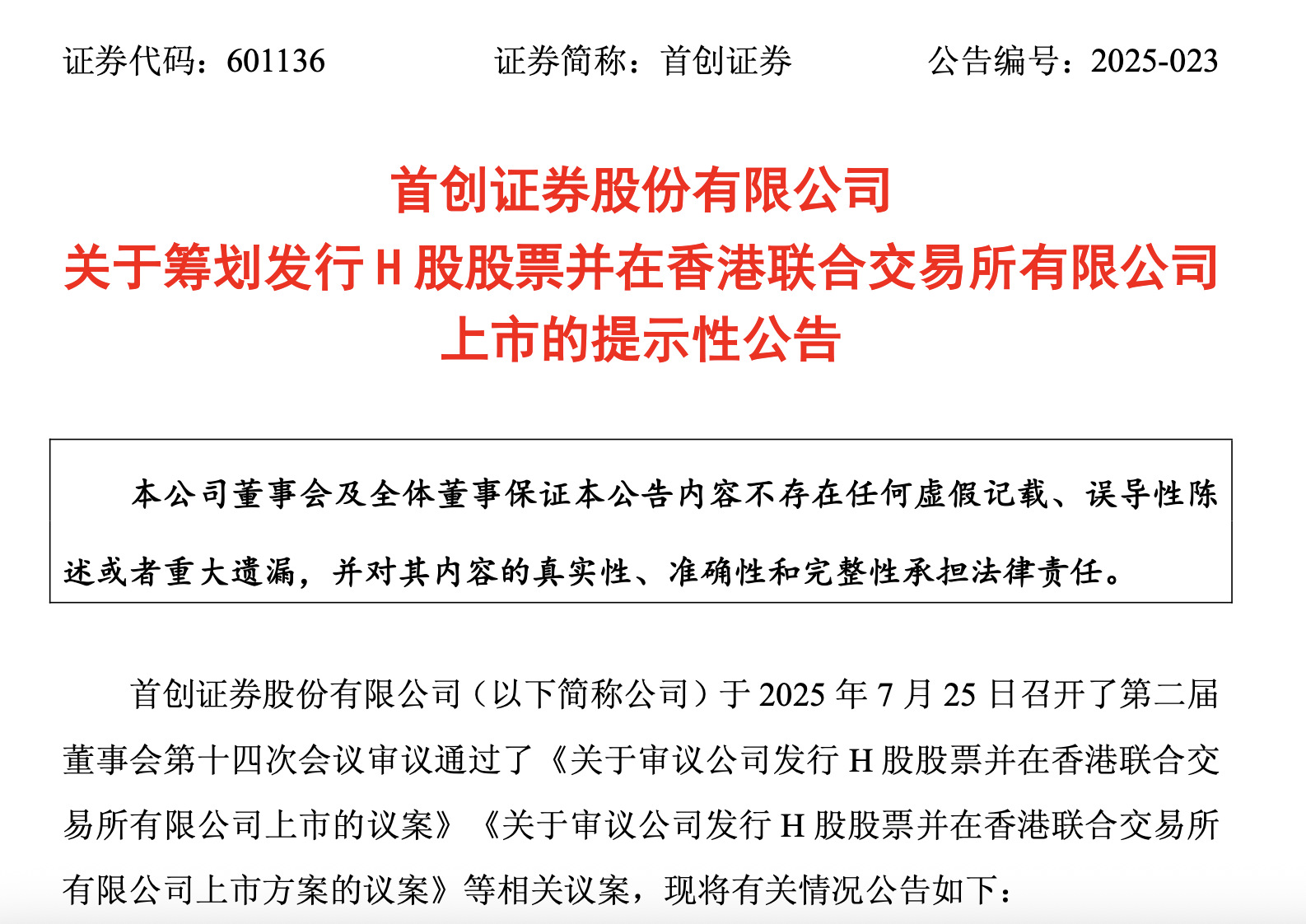 7月25日晚間,首創(chuàng)證券發(fā)布公告稱,于2025年7月25日召開了第二屆董事會(huì)第十四次會(huì)議審議通過了《關(guān)于審議公司發(fā)行H股股票并在香港聯(lián)合交易所有限公司上市的議案》《關(guān)于審議公司發(fā)行H股股票并在香港聯(lián)合交易所有限公司上市方案的議案》等相關(guān)議案。