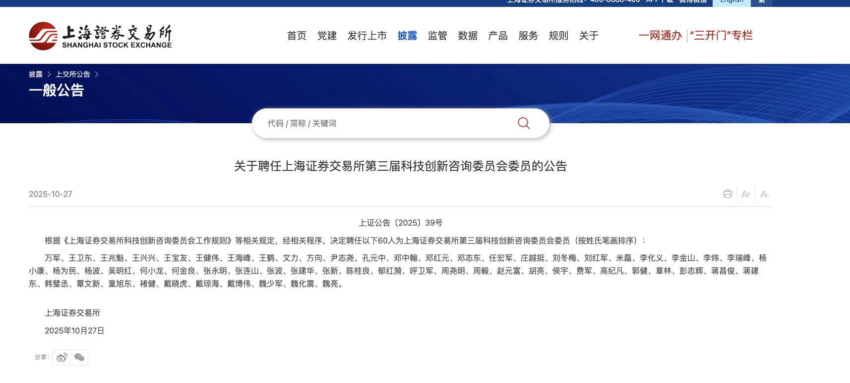 本報訊 (記者毛藝融)10月27日晚,上交所官網發(fā)布消息稱,已聘任第三屆科技創(chuàng)新咨詢委員會(以下簡稱“咨詢委”)委員,并向社會公布。