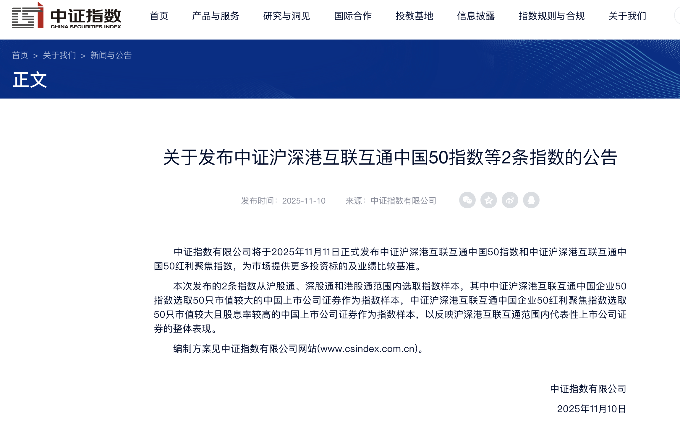 本報(bào)訊 (記者毛藝融)11月10日,中證指數(shù)有限公司在官網(wǎng)公告稱,將于2025年11月11日正式發(fā)布中證滬深港互聯(lián)互通中國(guó)50指數(shù)和中證滬深港互聯(lián)互通中國(guó)50紅利聚焦指數(shù),為市場(chǎng)提供更多投資標(biāo)的及業(yè)績(jī)比較基準(zhǔn)。