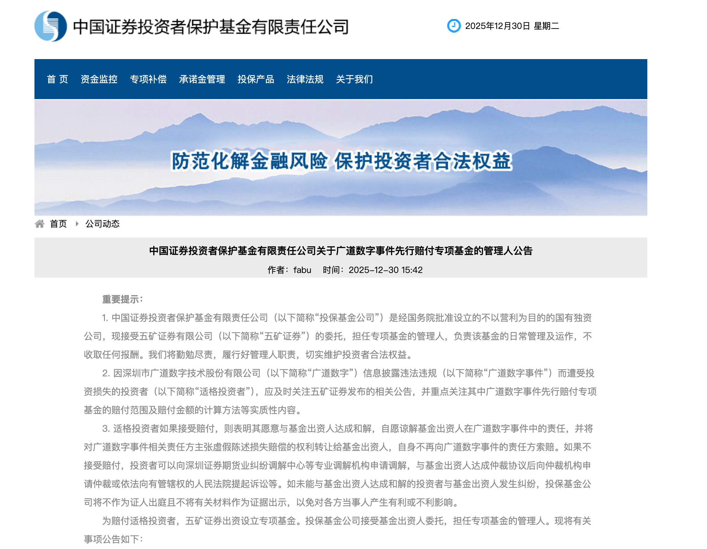 投?;鸸臼墙?jīng)國務(wù)院批準(zhǔn)設(shè)立的不以營利為目的的國有獨資公司。投保基金公司表示,現(xiàn)接受五礦證券有限公司(以下簡稱“五礦證券”)的委托,擔(dān)任專項基金的管理人,負責(zé)該基金的日常管理及運作,不收取任何報酬。投保基金公司將勤勉盡責(zé),履行好管理人職責(zé),切實維護投資者合法權(quán)益。