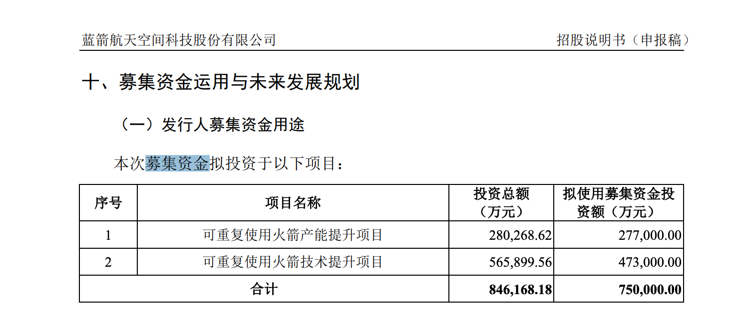 招股書申報(bào)稿顯示,藍(lán)箭航天IPO擬募資75億元。藍(lán)箭航天表示,通過本次上市募集資金,大力提升公司可重復(fù)使用火箭技術(shù)研發(fā)、提高發(fā)動(dòng)機(jī)與火箭批量化制造能力,充分發(fā)揮自身在火箭設(shè)計(jì)、研發(fā)、試驗(yàn)、生產(chǎn)總裝、發(fā)射的全鏈條交付能力,實(shí)現(xiàn)低成本、大運(yùn)力、可重復(fù)使用火箭的商業(yè)化運(yùn)營,積極響應(yīng)國家戰(zhàn)略規(guī)劃與迫切的發(fā)射服務(wù)市場需求。