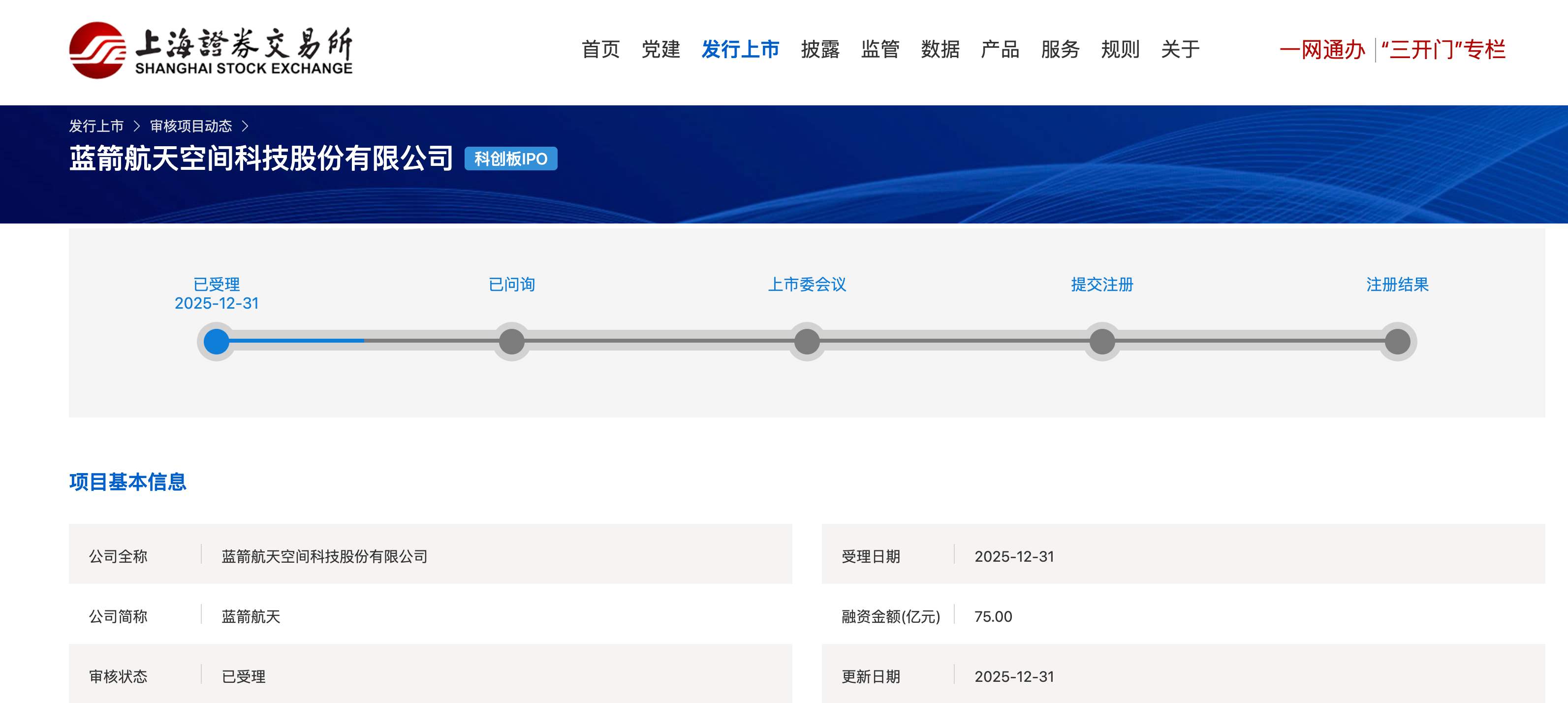 本報(bào)訊 (記者毛藝融)2025年12月31日,上交所官網(wǎng)信息顯示,藍(lán)箭航天空間科技股份有限公司(簡稱“藍(lán)箭航天”)科創(chuàng)板IPO申請(qǐng)獲受理,正式?jīng)_刺科創(chuàng)板“商業(yè)火箭第一股”。