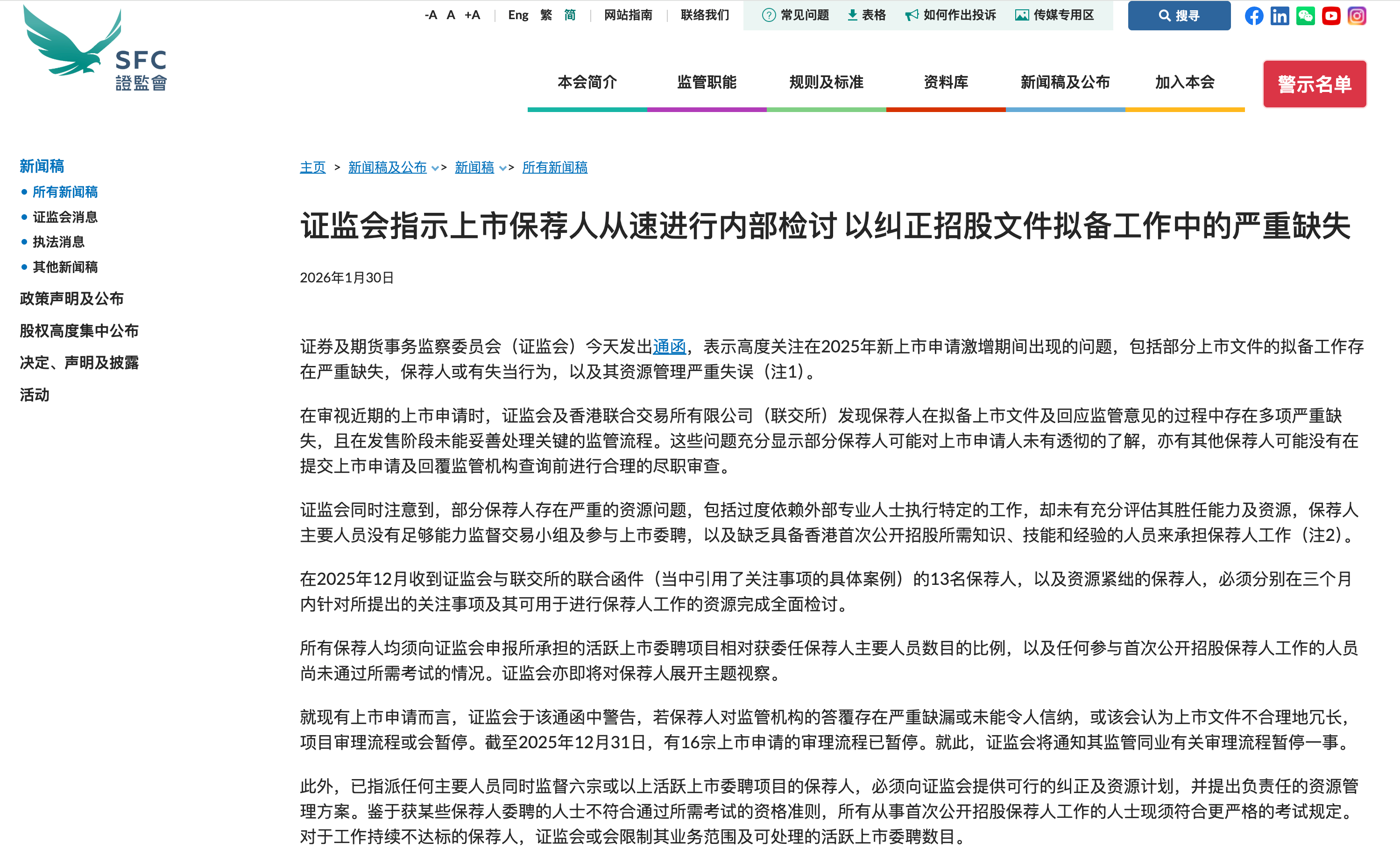 1月30日,香港證券及期貨事務(wù)監(jiān)察委員會(以下簡稱“香港證監(jiān)會”)發(fā)出通函,表示高度關(guān)注在2025年新上市申請激增期間出現(xiàn)的問題,包括部分上市文件的擬備工作存在嚴重缺失,保薦人或有失當行為,以及其資源管理嚴重失誤。