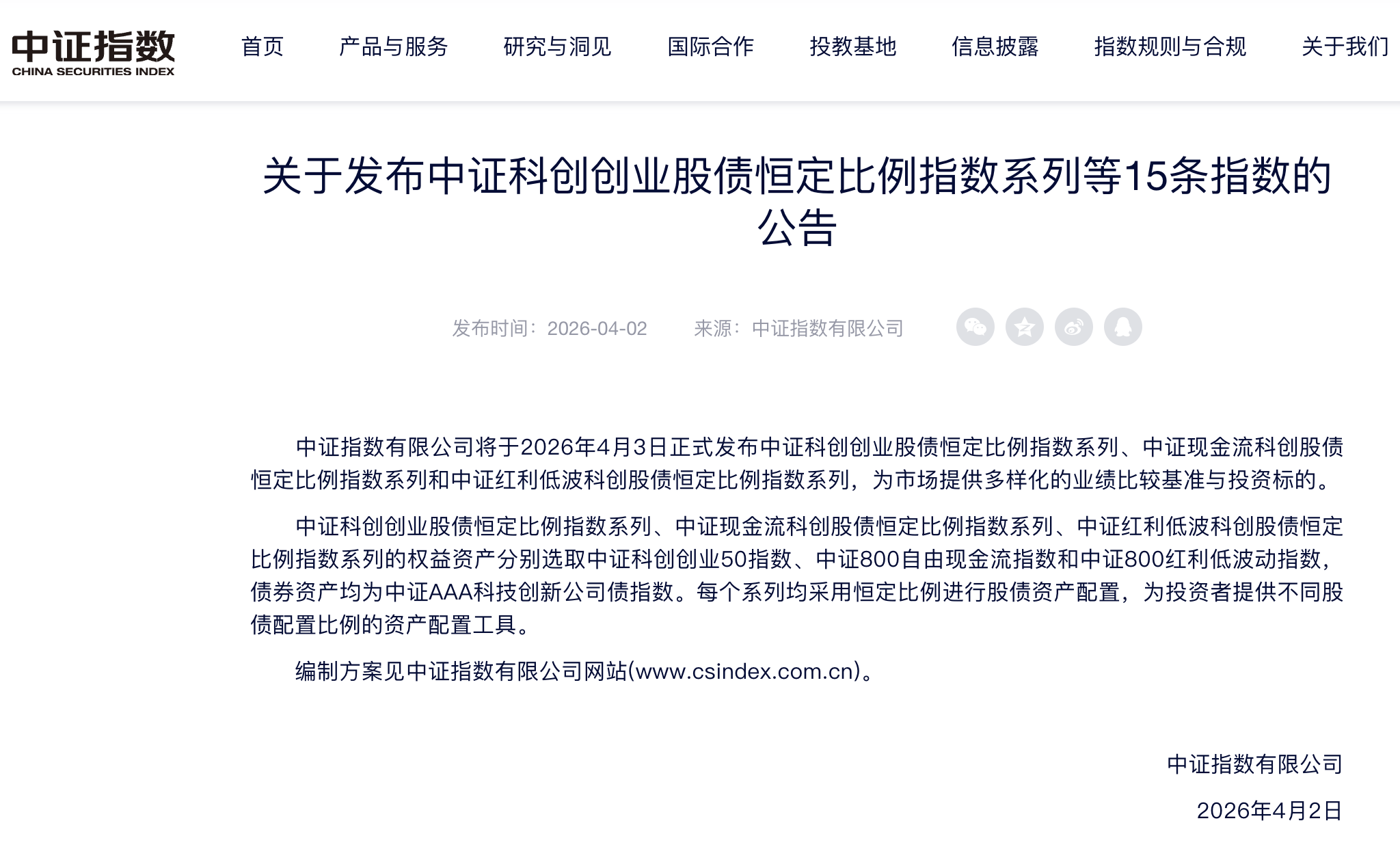 本報訊 (記者毛藝融)4月2日,中證指數(shù)有限公司官網(wǎng)顯示,中證指數(shù)有限公司將于2026年4月3日正式發(fā)布中證科創(chuàng)創(chuàng)業(yè)股債恒定比例指數(shù)系列、中證現(xiàn)金流科創(chuàng)股債恒定比例指數(shù)系列和中證紅利低波科創(chuàng)股債恒定比例指數(shù)系列,為市場提供多樣化的業(yè)績比較基準(zhǔn)與投資標(biāo)的。