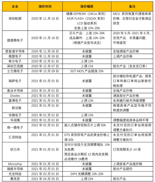 表1:近期已披露漲價(jià)通知的芯片企業(yè)