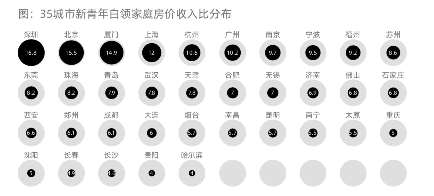 如果考慮到收入水平,深圳、北京、廈門、上海、杭州等14城房價收入比處于高位;南寧、太原、重慶等8城房價收入比處于低位;天津、合肥、無錫、濟(jì)南、佛山、石家莊等13城房價收入比處于合理區(qū)間。