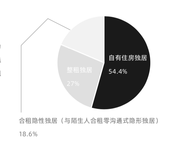 報告顯示,在新青年受訪群體中,獨居的百分占比高達(dá)63.6%。從居住方式看,選擇自由住房獨居的約54.4%,其次是整租獨居,百分占比約27%,還有18.6%的受訪者因與陌生人合租零溝通,隱形獨居。