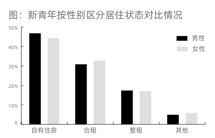 報告顯示,租房仍是新青年的主流,約49.2%的受訪者目前正租房居住,約45.3%受訪者的居住狀態(tài)是自有住房。無論男性還是女性,合租均是主流的租賃方式,但男性受訪者自有住房的占比相對更高。