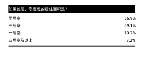 報告認(rèn)為,一居室生活空間較為狹小,三居室資金負(fù)擔(dān)較重、居住空間浪費。在經(jīng)濟(jì)條件允許的情況下,兩居室更能實現(xiàn)獨居群體對居住舒適性的追求,同時可滿足新青年后續(xù)過渡到婚姻生活的住房需求。
