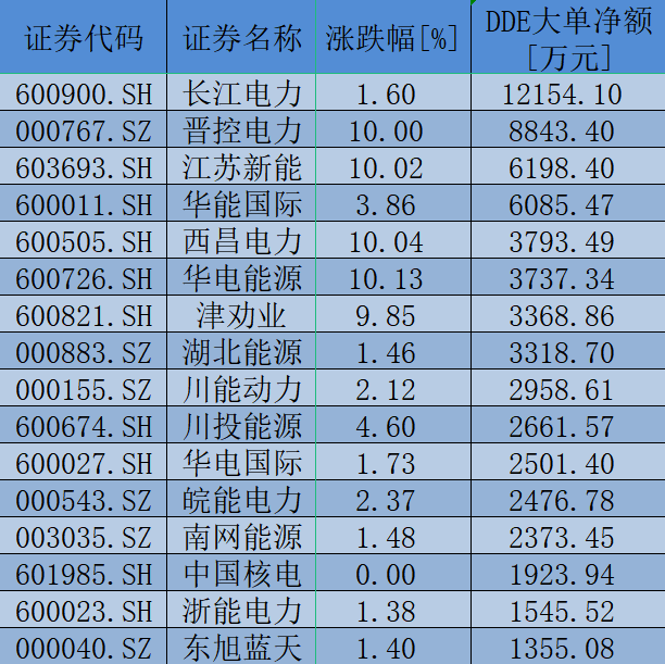 電力板塊的上漲也吸引了資金的追捧。同花順數(shù)據(jù)顯示,今日共有38只個(gè)股受到大單資金青睞。其中,長江電力的大單資金凈流入額達(dá)到12154.10萬元;另外,包括晉控電力(8843.40萬元)、江蘇新能(6198.40萬元)、華能國際(6085.47萬元)、西昌電力(3793.49萬元)、華電能源(3737.34萬元)等在內(nèi)的15只個(gè)股的大單資金凈流入額也超過1000萬元。