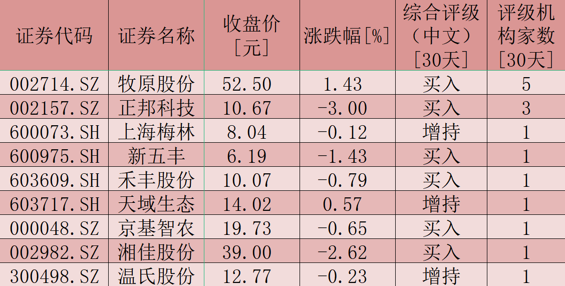 表:最近30日內(nèi),豬肉板塊獲機(jī)構(gòu)給予“買入”或“增持”等看好評級個股一覽