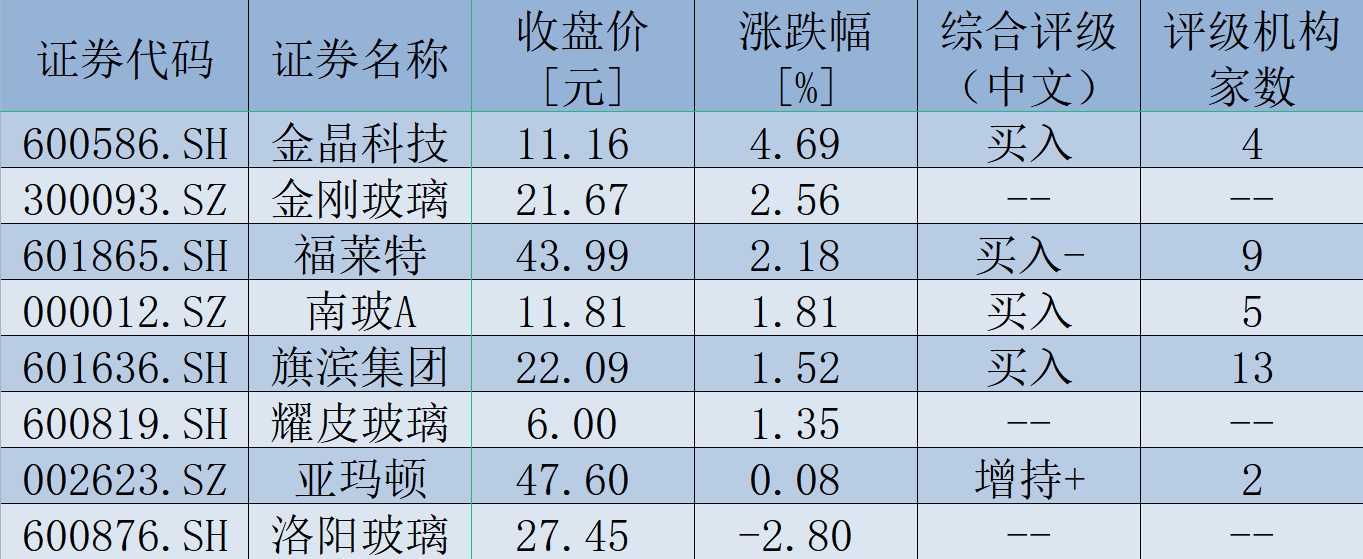 值得一提的是,最近30日內(nèi),有5只玻璃制造板塊個(gè)股獲機(jī)構(gòu)給予“買入”或“增持”等看好評(píng)級(jí)。其中,旗濱集團(tuán)和福萊特分別獲得13次和9次看好評(píng)級(jí),南玻A(5次)、金晶科技(4次)、亞瑪頓(2次)等3只個(gè)股也獲得了機(jī)構(gòu)給予的看好評(píng)級(jí)。